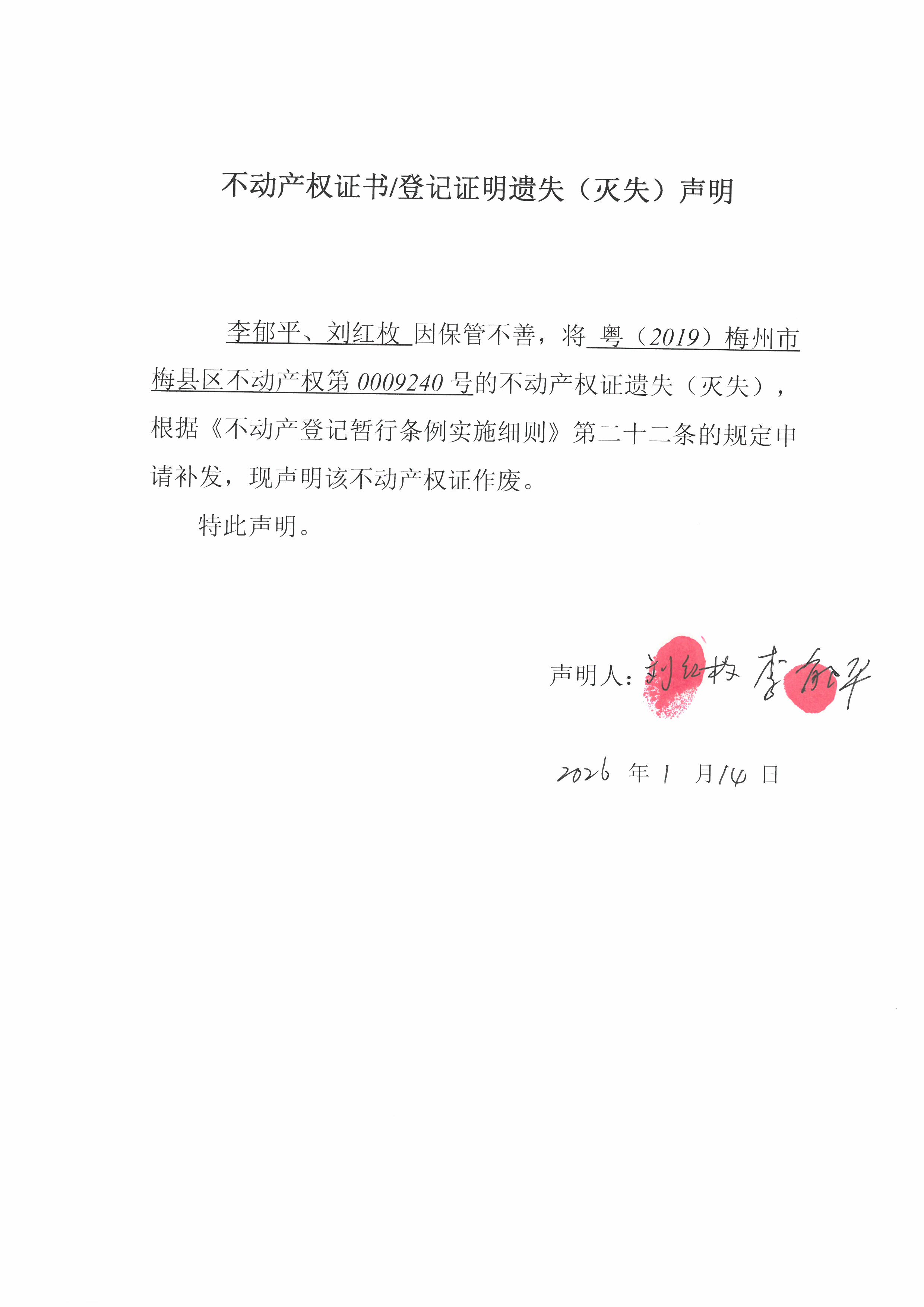 李郁平、刘红枚因保管不善,将粤(2019)梅州市梅县区不动产权第0009240号的不动产权证遗失(灭失)根据《不动产登记暂行条例实施细则》第二十二条的规定申请补发,现声明该不动产权证作废。