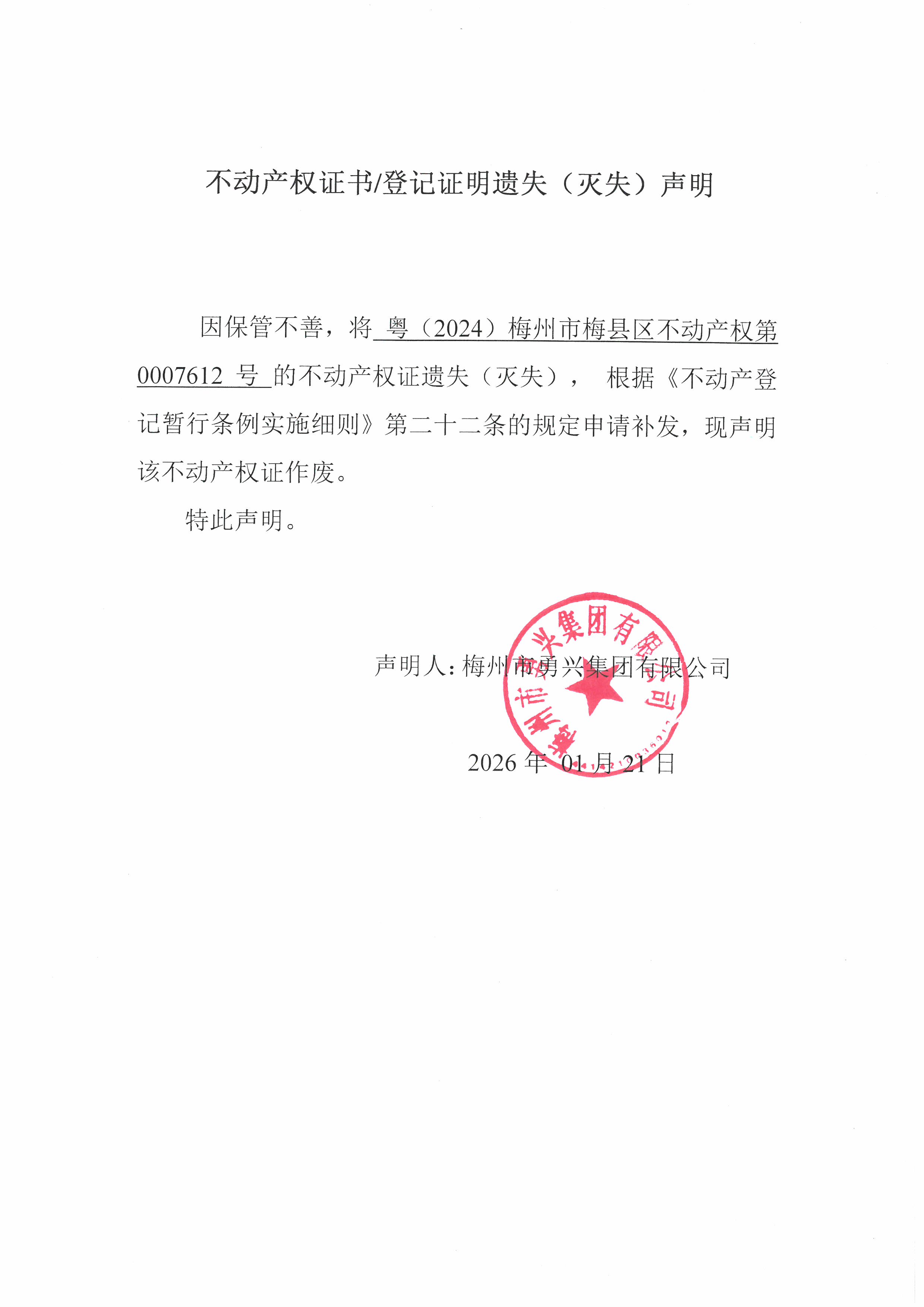 因保管不善,将粤(2024)梅州市梅县区不动产权第0007612号的不动产权证遗失(灭失),根据《不动产登记暂行条例实施细则》第二十二条的规定申请补发,现声明该不动产权证作废。