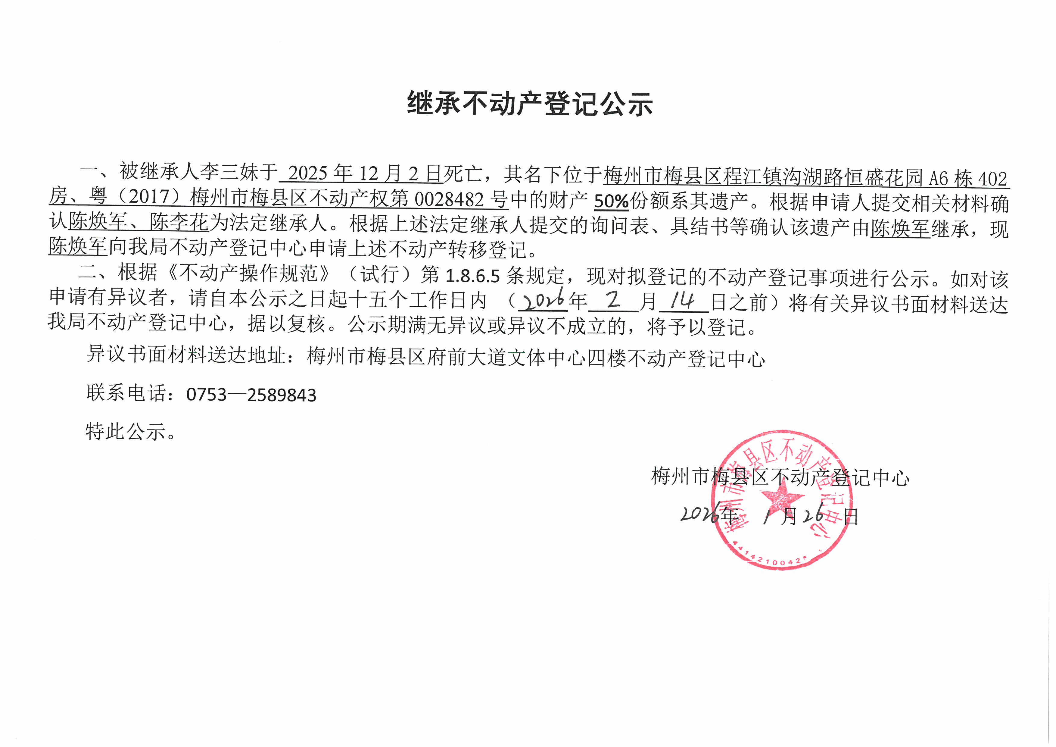 被继承人李三妹于2025年12月2日死亡,其名下位于梅州市梅县区程江镇沟湖路恒盛花园A6栋402房、粤(2017)梅州市梅县区不动产权第0028482号中的财产50%份额系其遗产。根据申请人提交相关材料确认陈焕军、陈李花为法定继承人。根据上述法定继承人提交的询问表、具结书等确认该遗产由陈焕军继承,现陈焕军向我局不动产登记中心申请上述不动产转移登记。