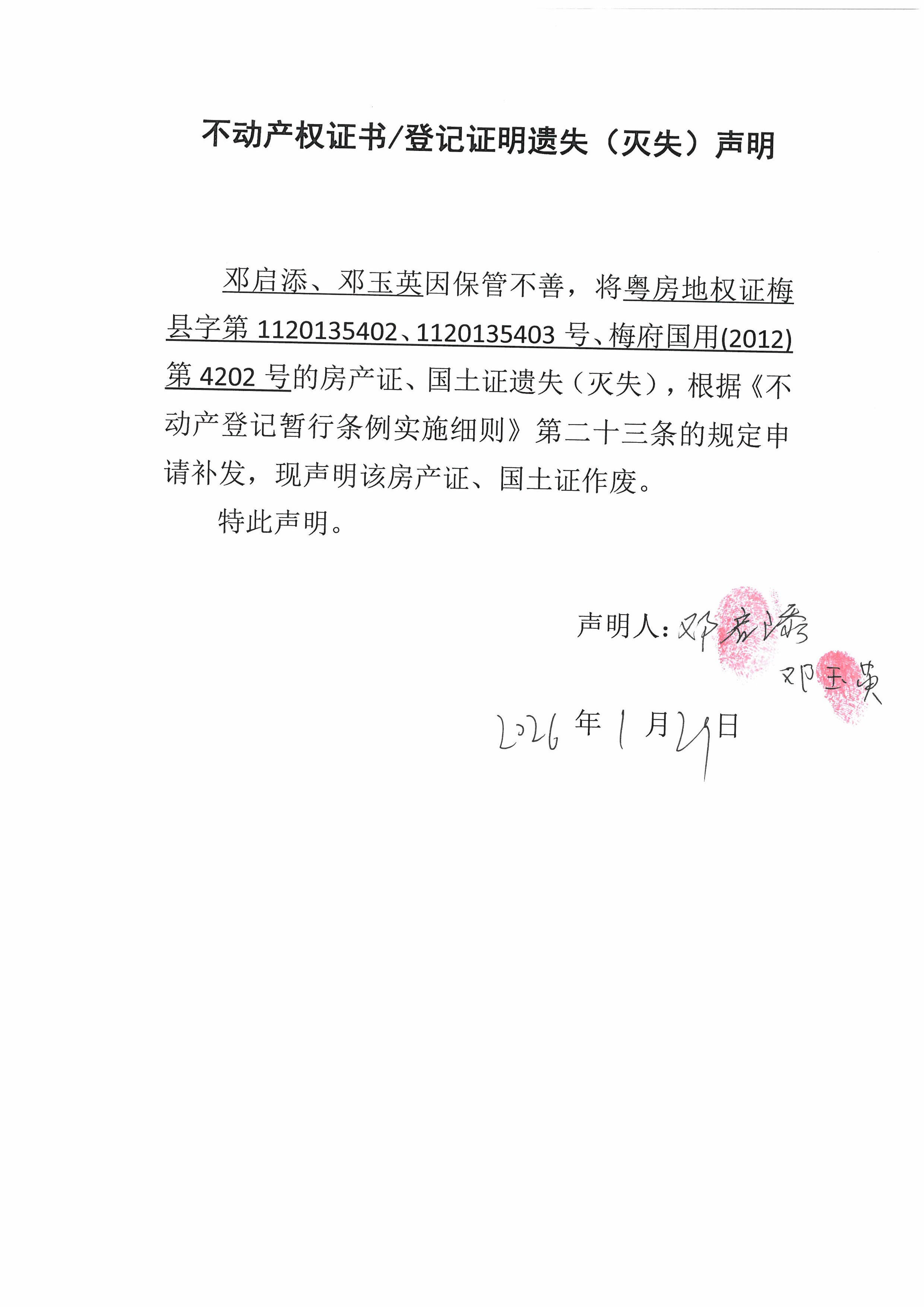 邓启添、邓玉英因保管不善,将粤房地权证梅县字第1120135402、1120135403号、梅府国用(2012)第4202号的房产证、国土证遗失(灭失),根据《不动产登记暂行条例实施细则》第二十三条的规定申请补发,现声明该房产证、国土证作废。特此声明。