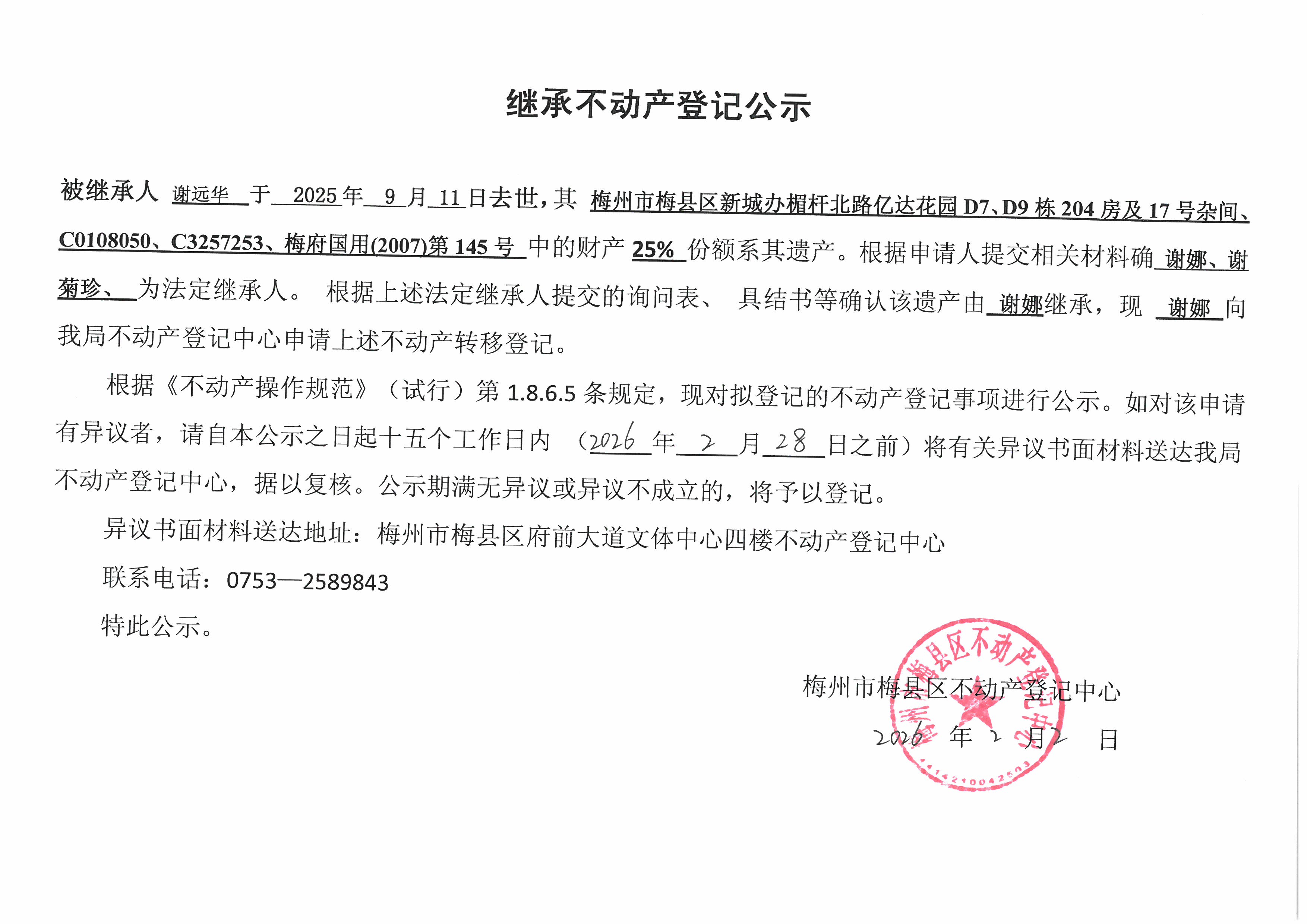 被继承人谢远华于2025年9月11日去世,其梅州市梅县区新城办杆北路亿达花园D7、D9栋204房及17号杂间、C0108050、C3257253、梅府国用(2007)第145号中的财产25%份额系其遗产。根据中请人提交相关材料确 谢娜、谢菊珍为法定继承人。根据上述法定继承人提交的询问表、具结书等确认该遗产由谢娜继承,现谢娜向我局不动产登记中心申请上述不动产转移登记。