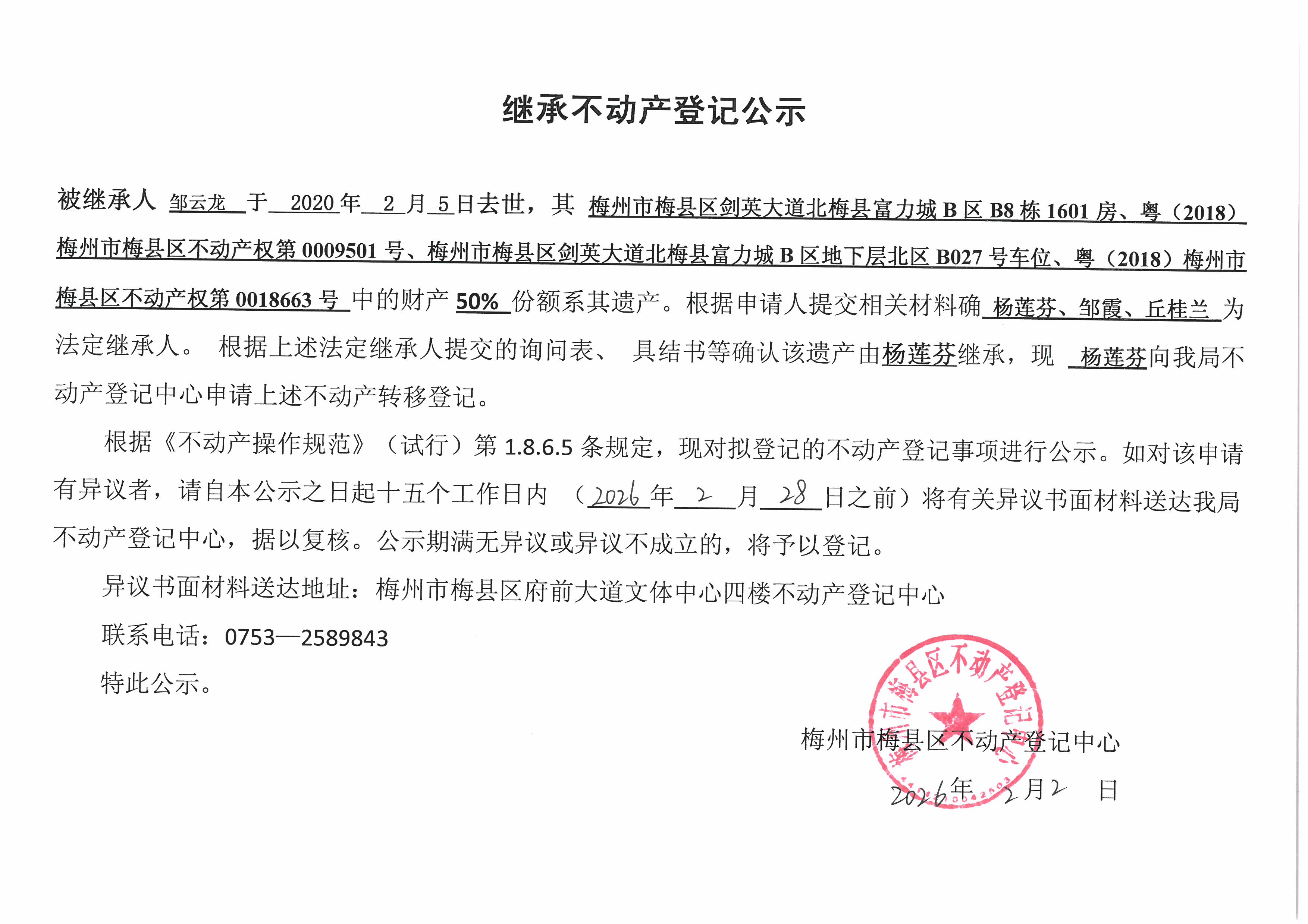 被继承人邹云龙于2020年2月5日去世,其梅州市梅县区剑英大道北梅县富力城B区B8栋1601房、粤(2018)梅州市梅县区不动产权第0009501号、梅州市梅县区剑英大道北梅县富力城B区地下层北区B027号车位、粤(2018)梅州市梅县区不动产权第0018663号中的财产50%份额系其遗产。根据申请人提交相关材料确杨莲芬、邹霞、丘桂兰为法定继承人。根据上述法定继承人提交的询问表、具结书等确认该遗产由杨莲芬继承,现杨莲芬向我局不动产登记中心申请上述不动产转移登记