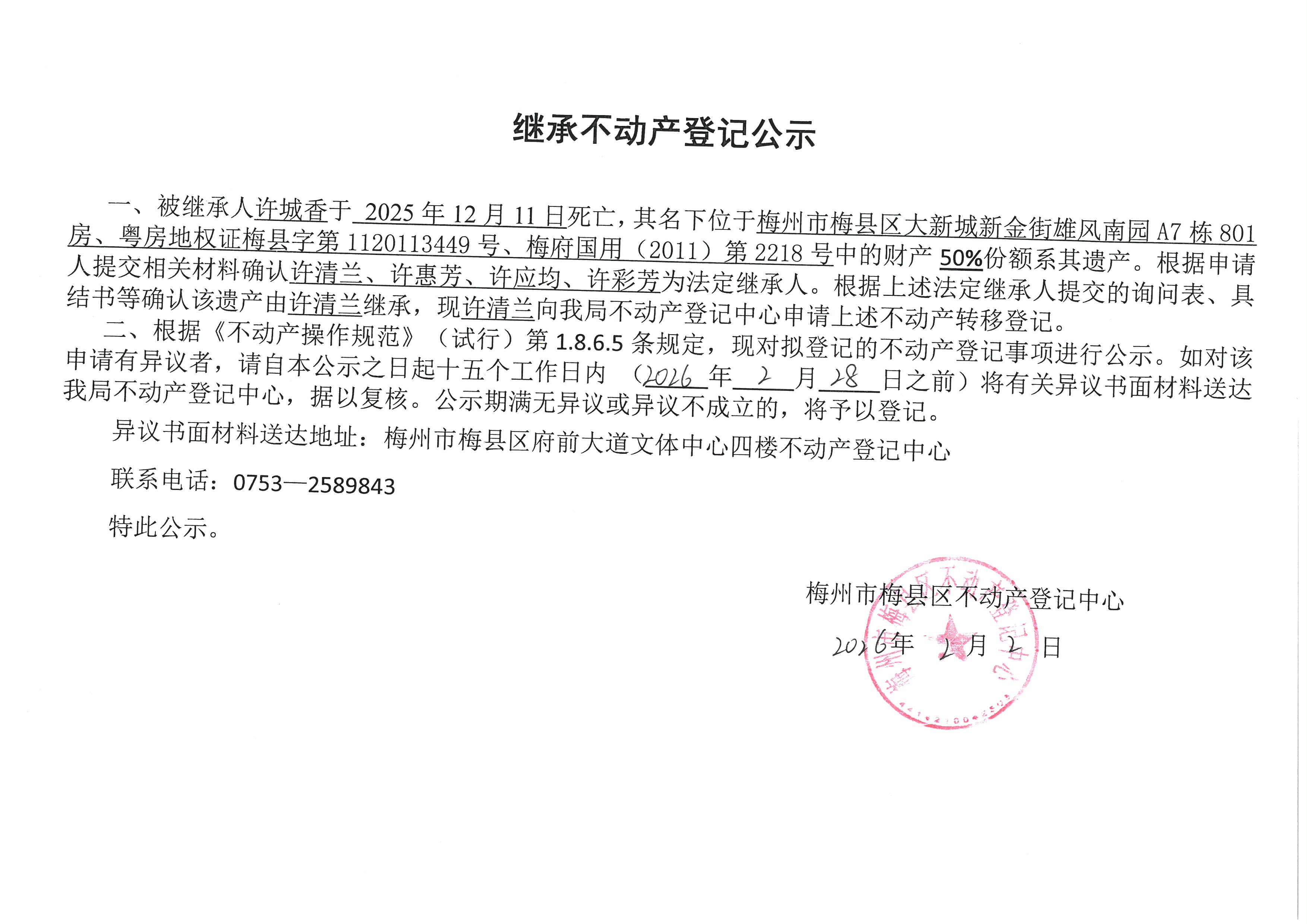 一、被继承人许城香于2025年12月11日死亡,其名下位于梅州市梅县区大新城新金街雄风南园A7栋801房、粤房地权证梅县字第1120113449号、梅府国用(2011)第2218号中的财产50%份额系其遗产。根据申请人提交相关材料确认许清兰、许惠芳、许应均、许彩芳为法定继承人。根据上述法定继承人提交的询问表、具结书等确认该遗产由许清兰继承,现许清兰向我局不动产登记中心申请上述不动产转移登记。