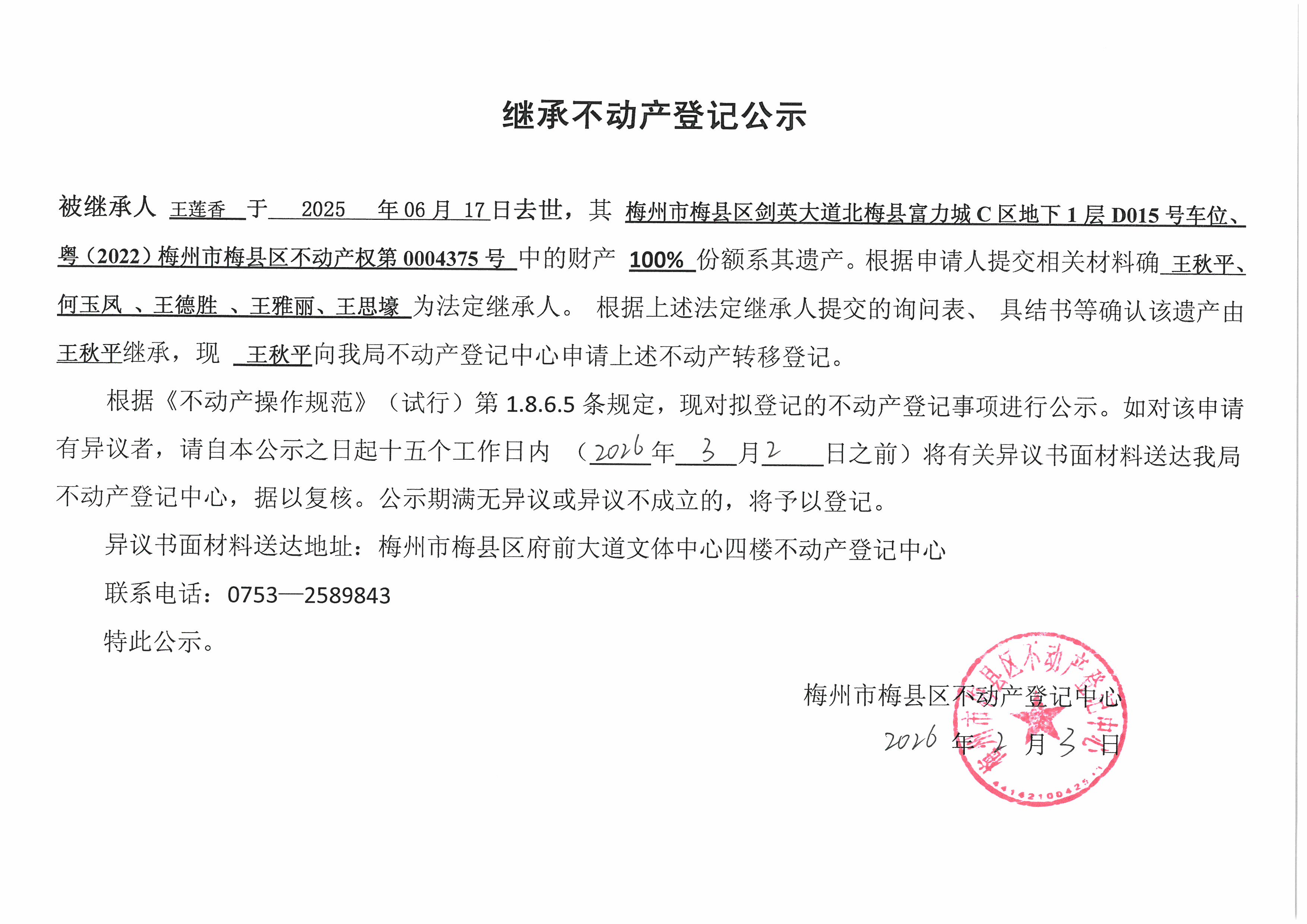 被继承人王莲香于2025年06月17日去世,其梅州市梅县区剑英大道北梅县富力城C区地下1层D015号车位,粤(2022)梅州市梅县区不动产权第0004375号中的财产100%份额系其遗产。根据申请人提交相关材料确王秋平、何玉风、王德胜、王雅丽、王思壕为法定继承人。根据上述法定继承人提交的询问表、具结书等确认该遗产由王秋平继承,现王秋平向我局不动产登记中心申请上述不动产转移登记。
