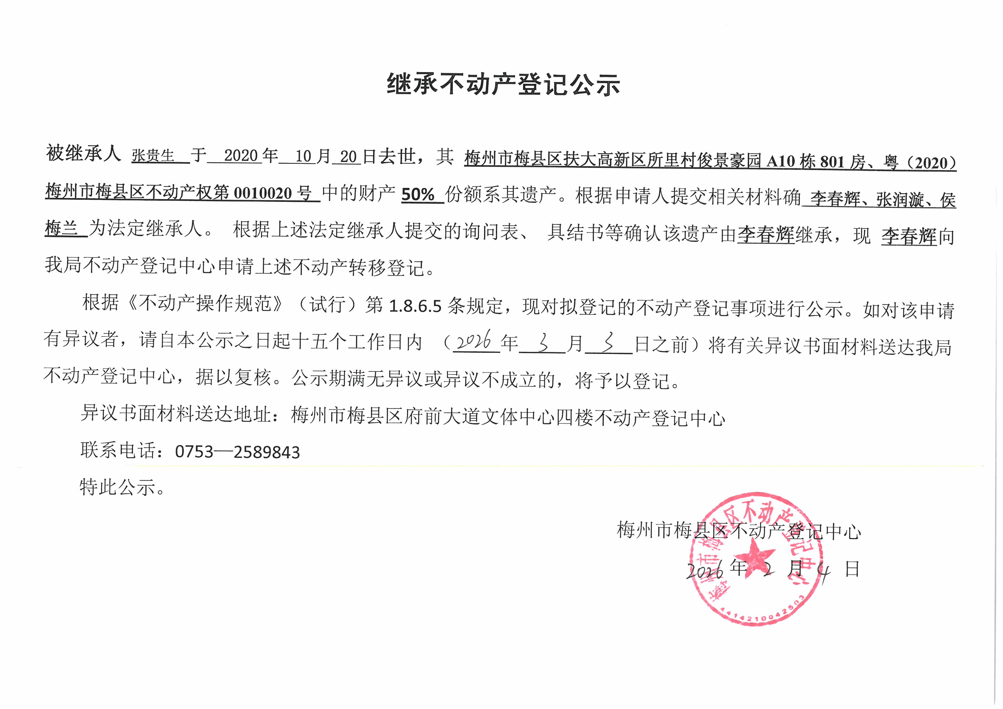 被继承人张贵生于2020年10月20日去世,其梅州市梅县区大高新区所里村俊景豪园A10栋801房、粤(2020)梅州市梅县区不动产权第0010020号中的财产50%份额系其遗产。根据申请人提交相关材料确认李春辉、张润漩、侯梅兰为法定继承人。根据上述法定继承人提交的询问表、具结书等确认该遗产由李春辉继承,现李春辉向我局不动产登记中心申请上述不动产转移登记。