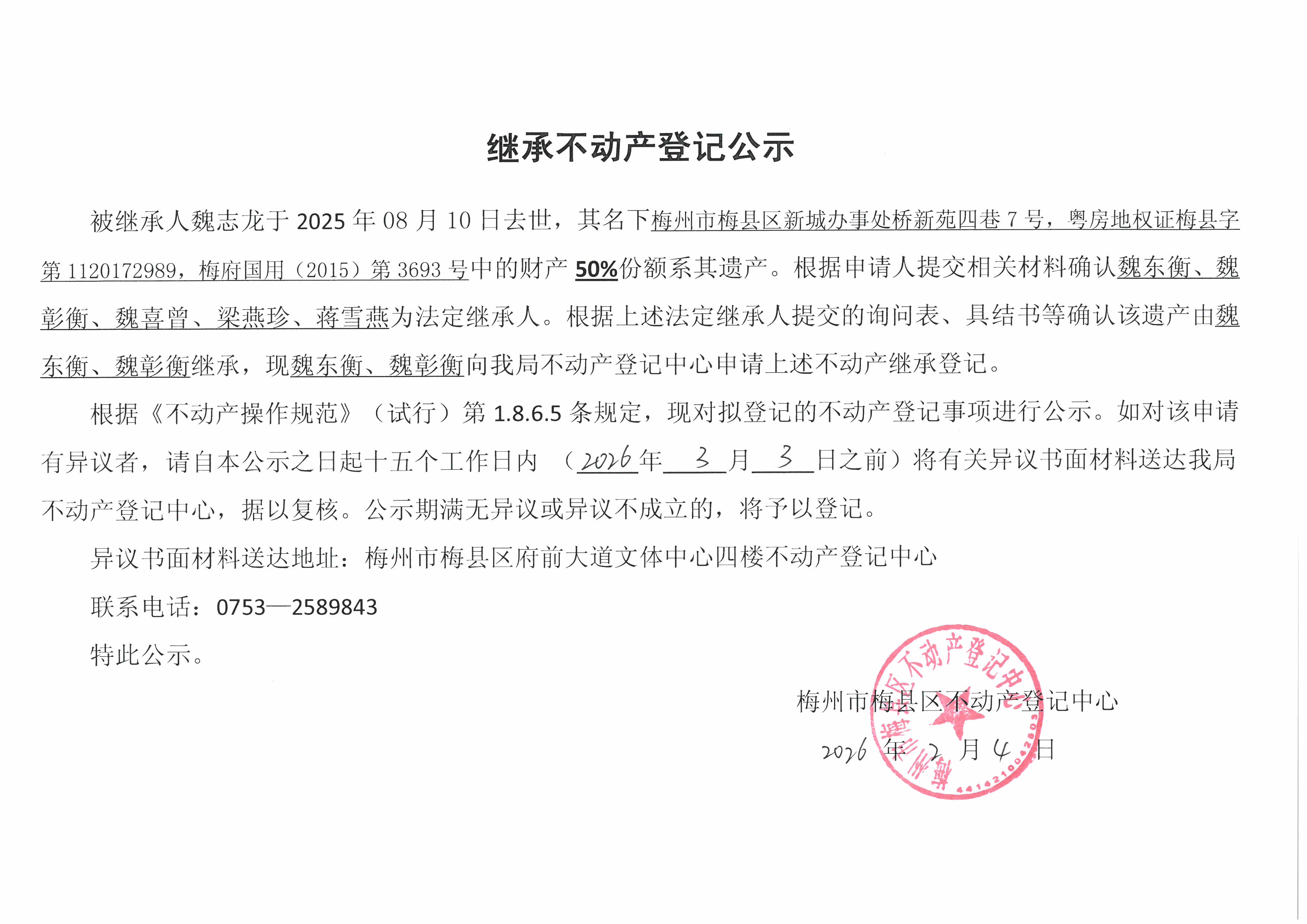 被继承人魏志龙于2025年08月10日去世,其名下梅州市梅县区新城办事处桥新苑四巷7号,粤房地权证梅县字第1120172989,梅府国用(2015)第3693号中的财产50%份额系其遗产。根据中请人提交相关材料确认魏东衡、魏彰衡、魏喜曾、梁燕珍、蒋雪燕为法定继承人。根据上述法定继承人提交的询问表、具结书等确认该遗产由魏东衡、魏彰衡继承,现魏东衡、魏彰衡向我局不动产登记中心申请上述不动产继承登记。