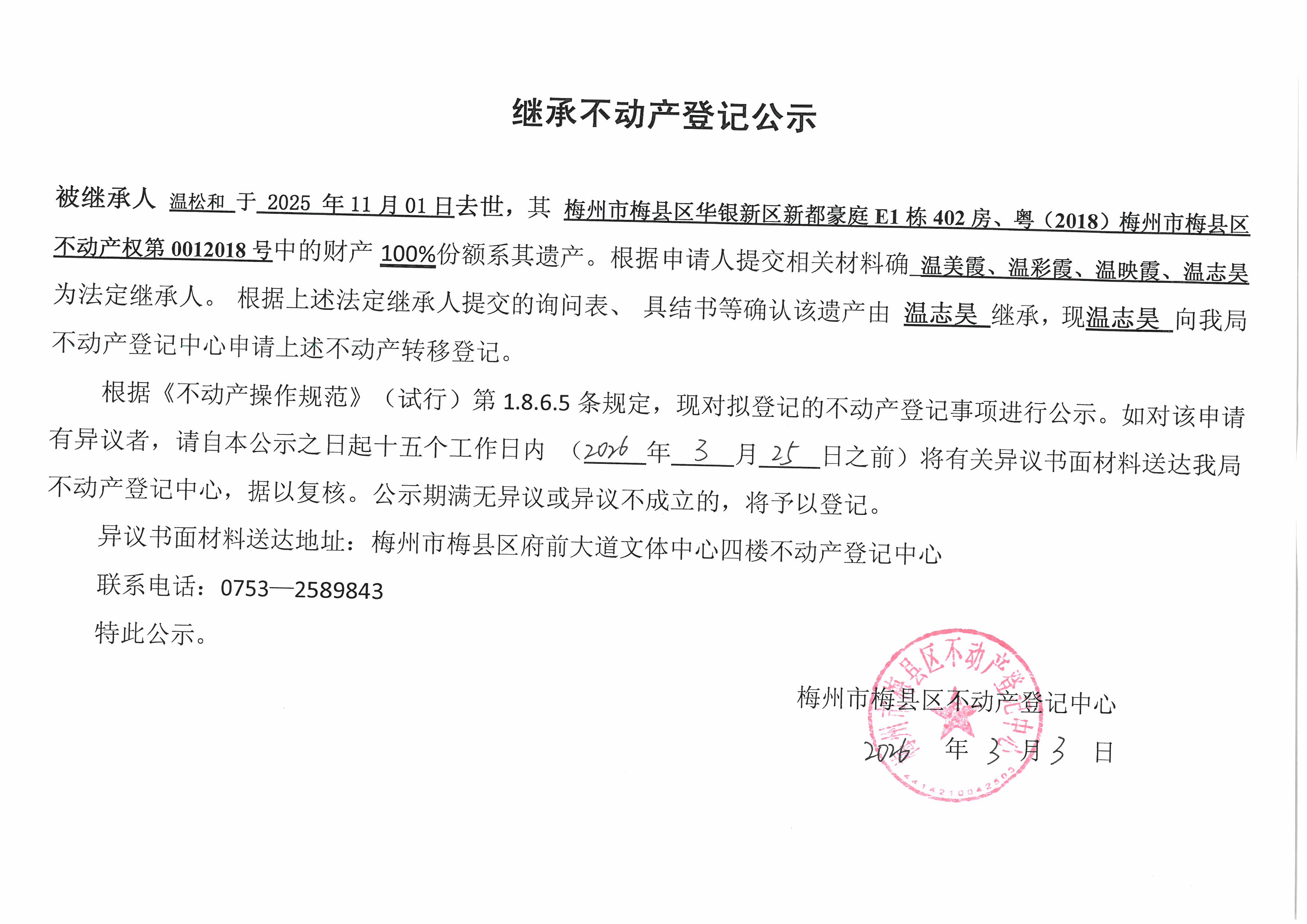 被继承人温松和于2025年11月01日去世,其梅州市梅县区华银新区新都豪庭E1栋402房、粤(2018)梅州市梅县区不动产权第0012018号中的财产100%份额系其遗产。根据申请人提交相关材料确认温美霞、温彩霞、温映霞、温志昊为法定继承人。根据上述法定继承人提交的询问表、具结书等确认该遗产由温志昊继承,现温志吴向我局不动产登记中心申请上述不动产转移登记。