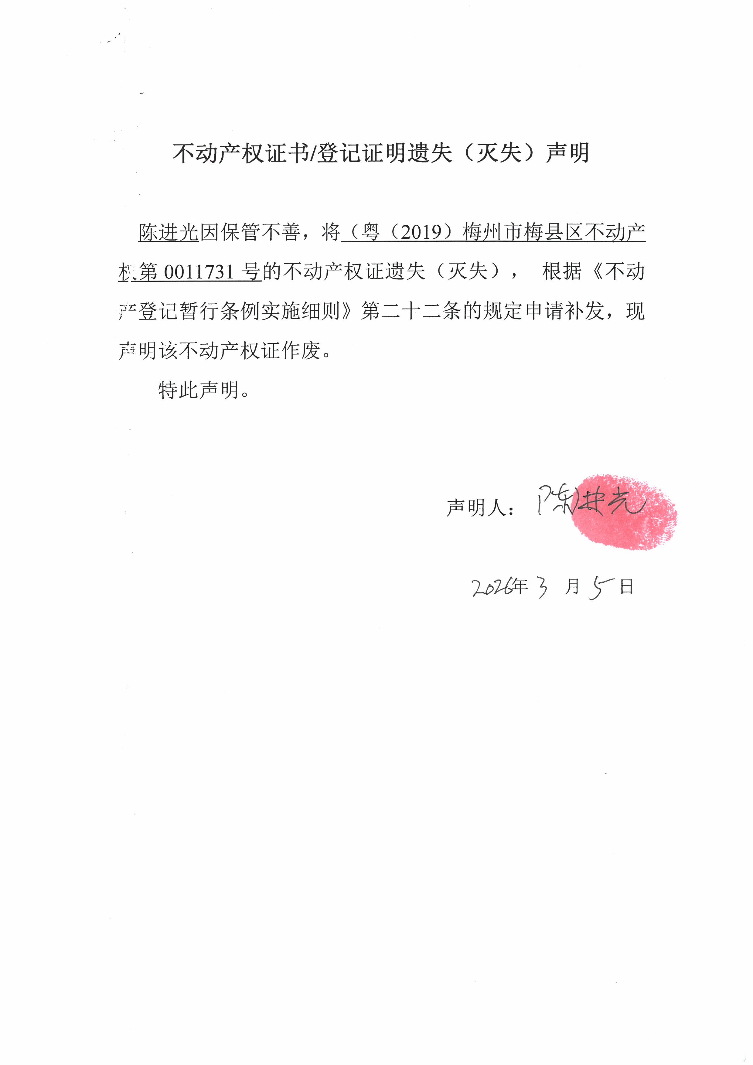 陈进光因保管不善,将粤(2019)梅州市梅县区不动产权第0011731号的不动产权证遗失(灭失),根据《不动产登记暂行条例实施细则》第二十二条的规定申请补发,现声明该不动产权证作废。