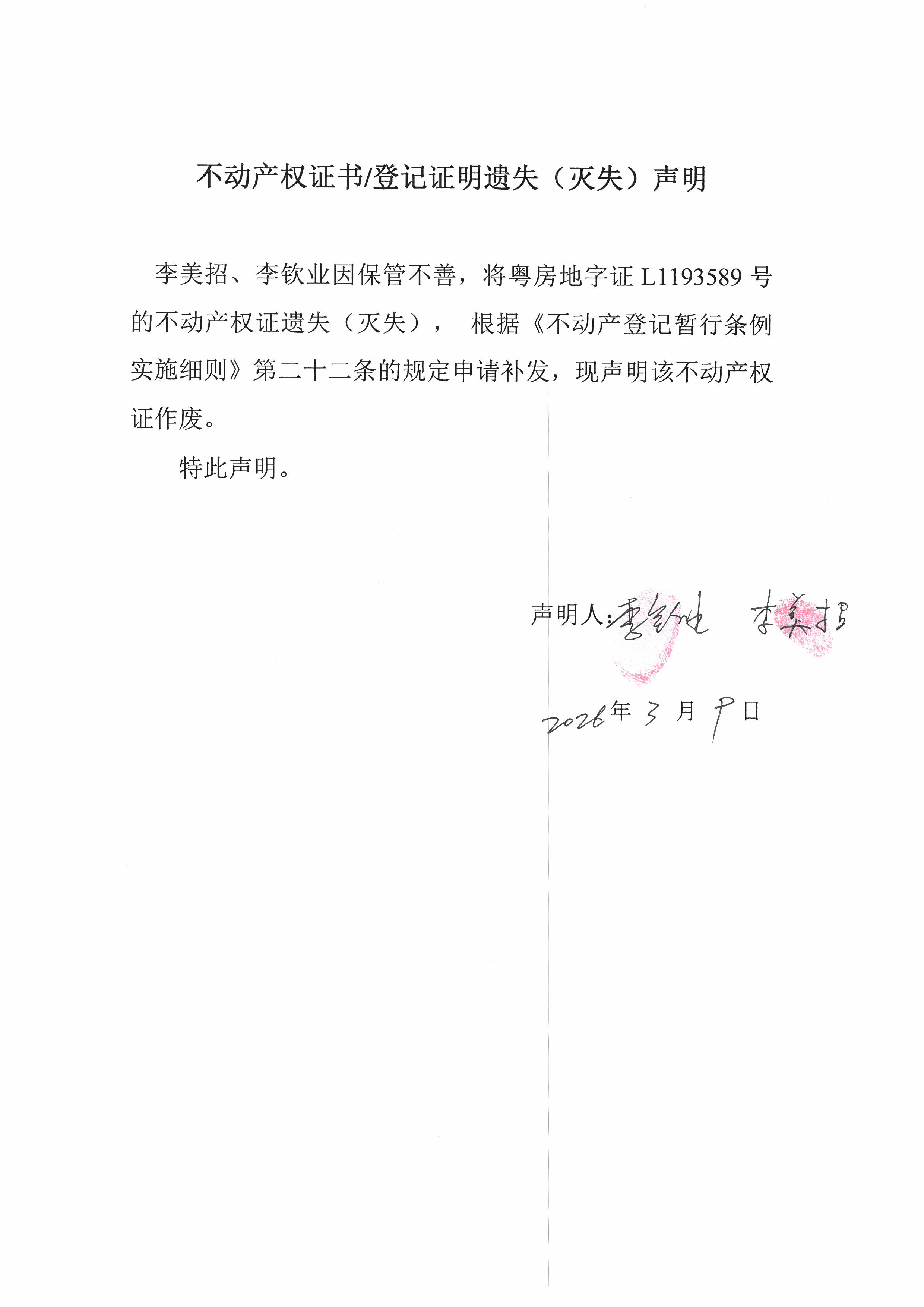 李美招、李钦业因保管不善,将粤房地字证L1193589号的不动产权证遗失(灭失),根据《不动产登记暂行条例实施细则》第二十二条的规定申请补发,现声明该不动产权证作废。