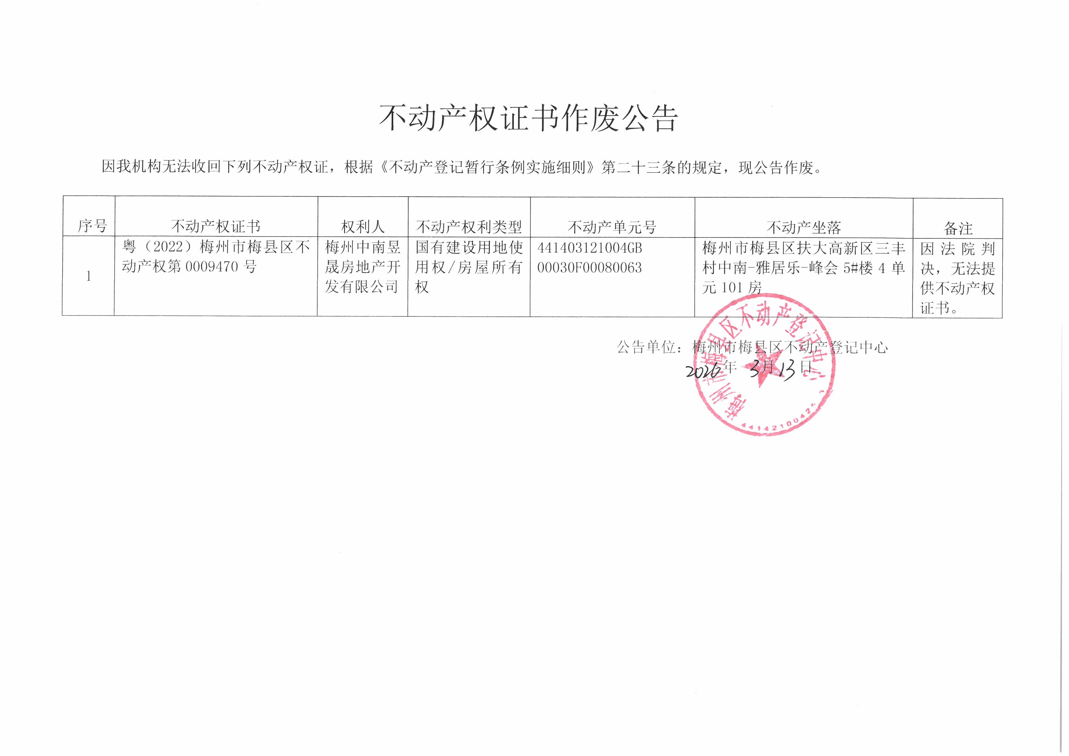 公告单位:梅州市梅县区不动产登记中心