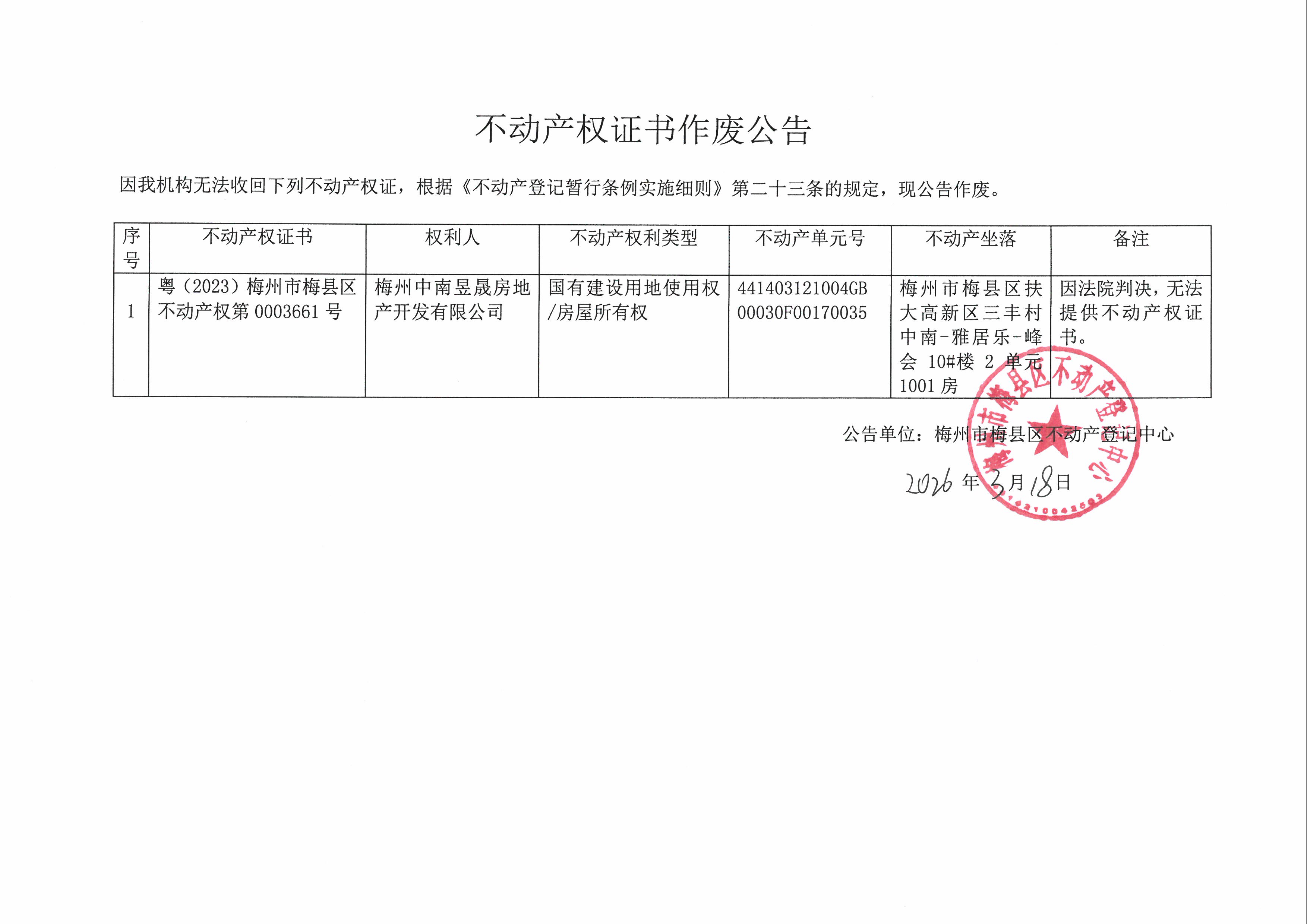公告单位:梅州市梅县区不动产登记中心