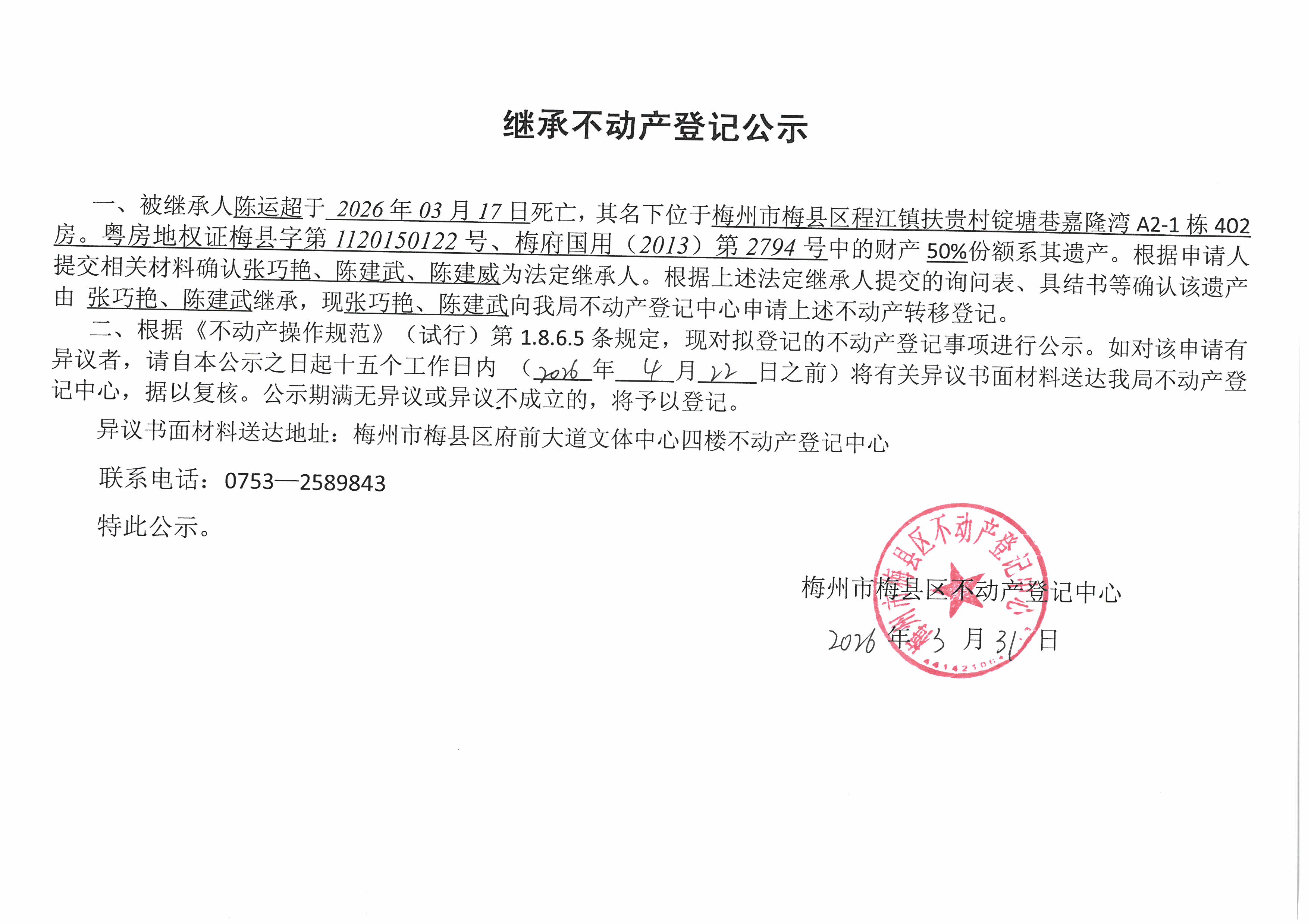 被继承人陈运超于2026年03月17日死亡,其名下位于梅州市梅县区程江镇扶贵村锭塘巷嘉隆湾A2-1栋402房。粤房地权证梅县字第1120150122号、梅府国用(2013)第2794号中的财产50%份额系其遗产。根据申请人提交相关材料确认张巧艳、陈建武、陈建威为法定继承人。根据上述法定继承人提交的询问表、具结书等确认该遗产由张巧艳、陈建武继承,现张巧艳、陈建武向我局不动产登记中心申请上述不动产转移登记。