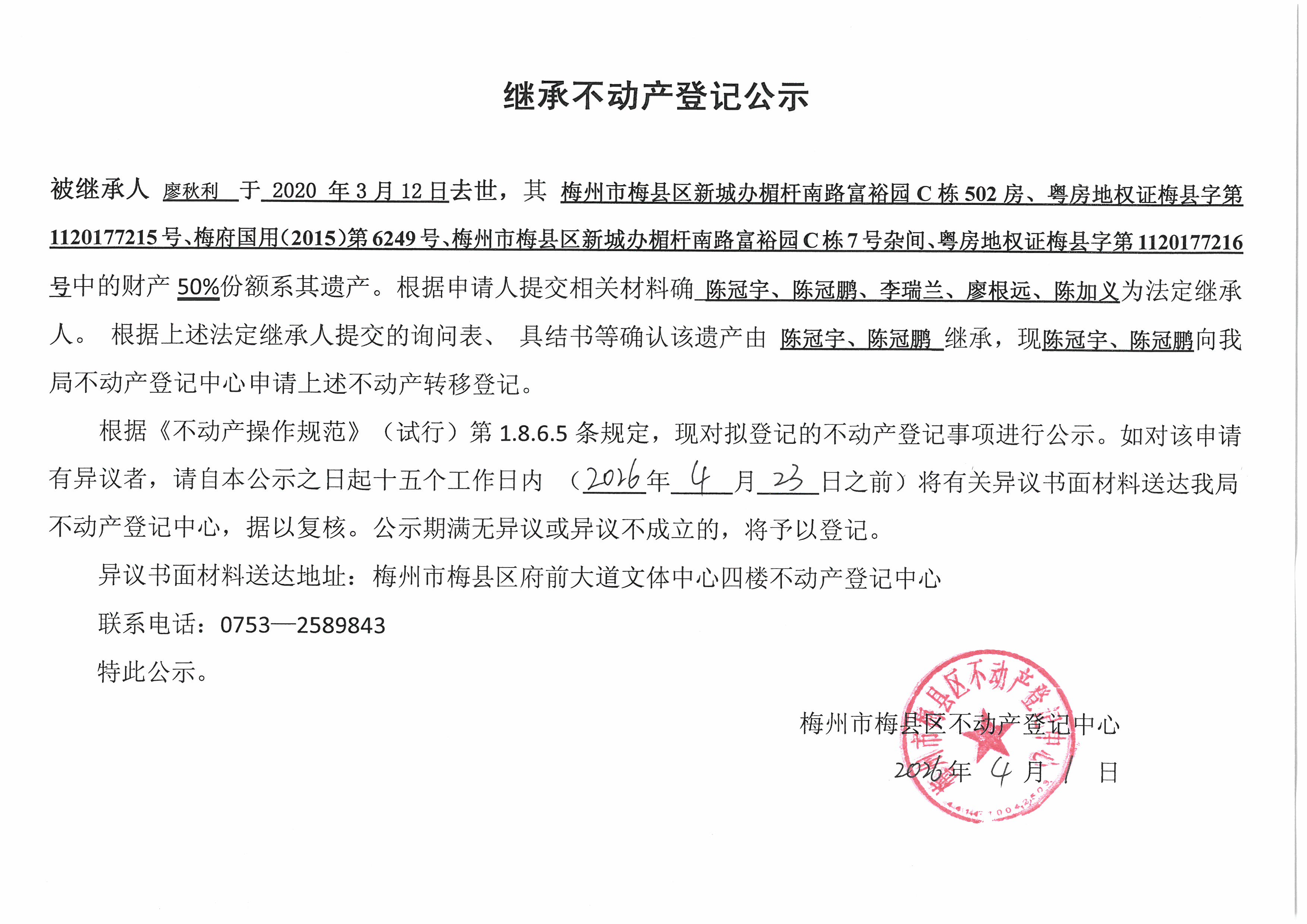 被继承人廖秋利于2020年3月12日去世,其梅州市梅县区新城办杆南路富裕园C栋502房、粤房地权证梅县字第1120177215号、梅府国用(2015)第6249号、梅州市梅县区新城办楣杆南路富裕园C栋7号杂间、粤房地权证梅县字第1120177216号中的财产50%份额系其遗产。根据申请人提交相关材料确陈冠宇、陈冠鹏、李瑞兰、廖根远、陈加义为法定继承人。根据上述法定继承人提交的询问表、具结书等确认该遗产由陈冠宇、陈冠鹏继承,现陈冠宇、陈冠鹏向我局不动产登记中心申请上述不动产转移登记。