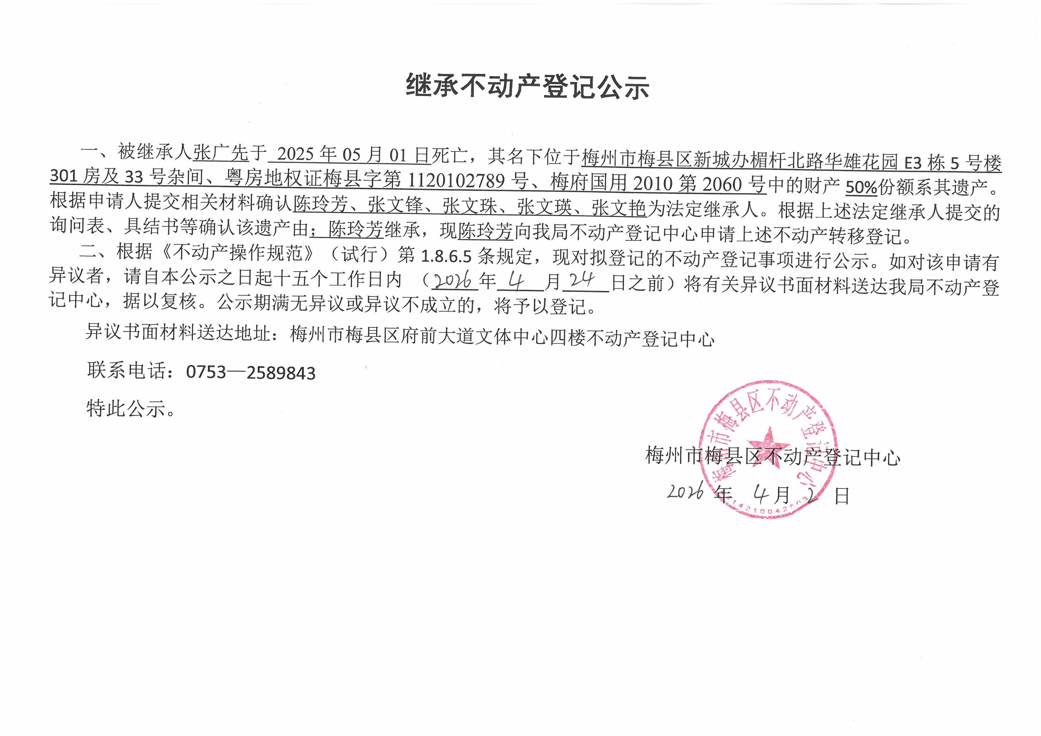 被继承人张广先于2025年05月01日死亡,其名下位于梅州市梅县区新城办楣杆北路华雄花园E3栋5号楼301房及33号杂间、粤房地权证梅县字第1120102789号、梅府国用2010第2060号中的财产50%份额系其遗产。根据申请人提交相关材料确认陈玲芳、张文锋、张文珠、张文瑛、张文艳为法定继承人。根据上述法定继承人提交的询问表、具结书等确认该遗产由陈玲芳继承,现陈玲芳向我局不动产登记中心申请上述不动产转移记。
