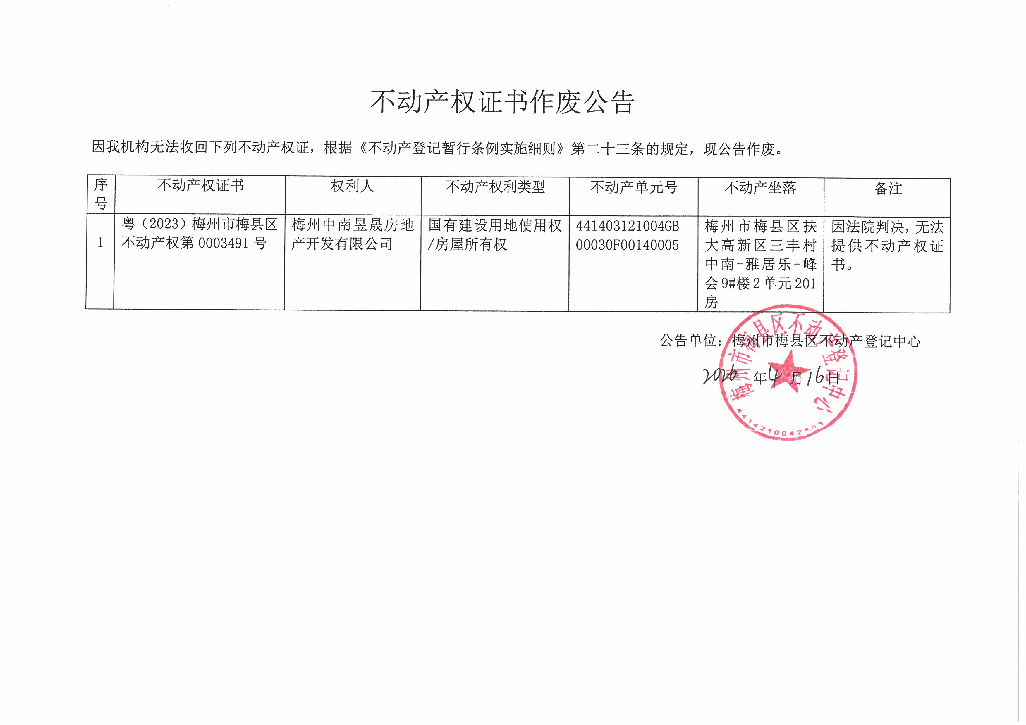 公告单位:梅州市梅县区不动产登记中心