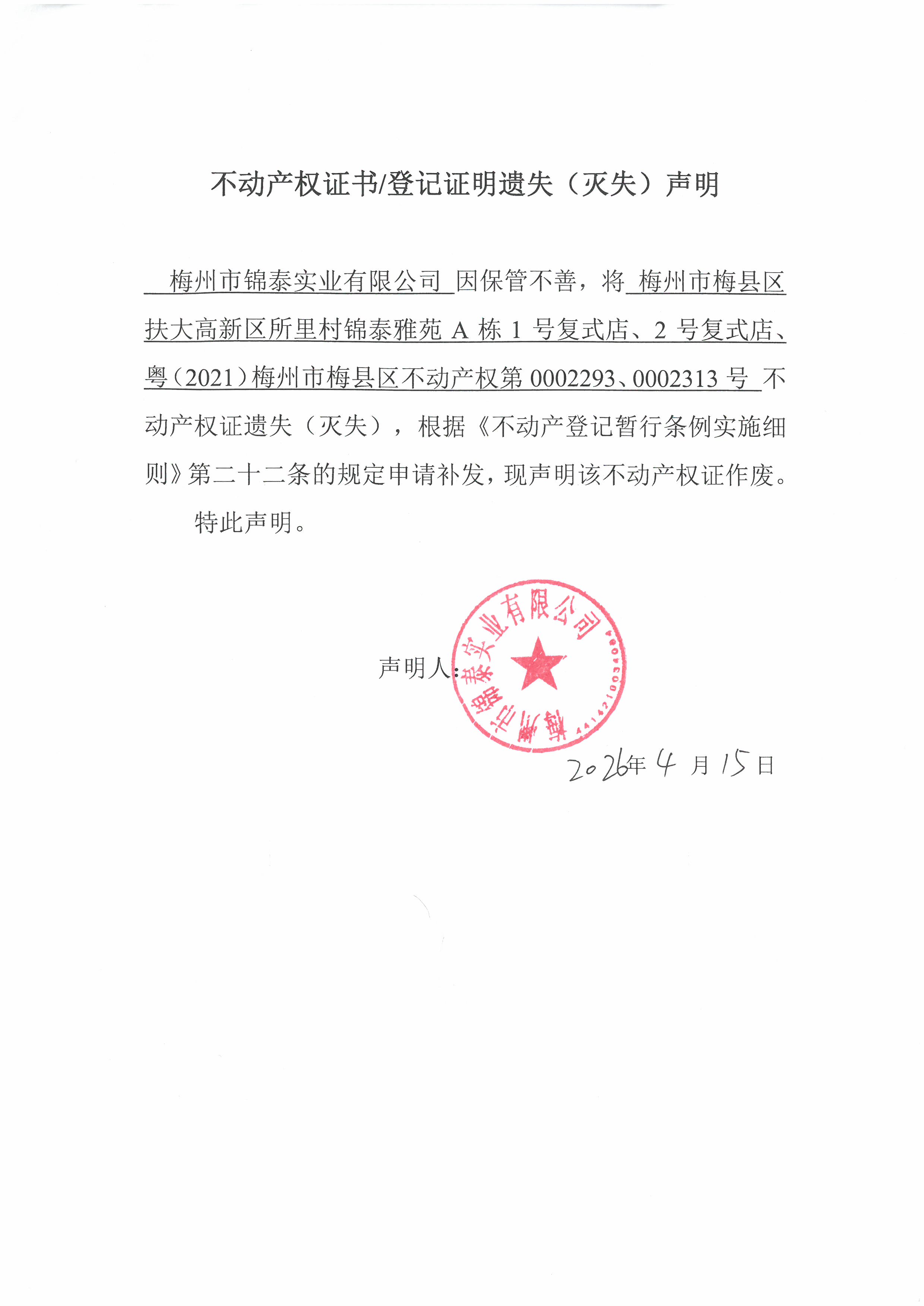 梅州市锦泰实业有限公司因保管不善,将梅州市梅县区扶大高新区所里村锦泰雅苑A栋1号复式店、2号复式店、粤(2021)梅州市梅县区不动产权第0002293、0002313号不动产权证遗失(灭失),根据《不产登记暂行条例实施细则》第二十二条的规定申请补发,现声明该不动产权证作废。