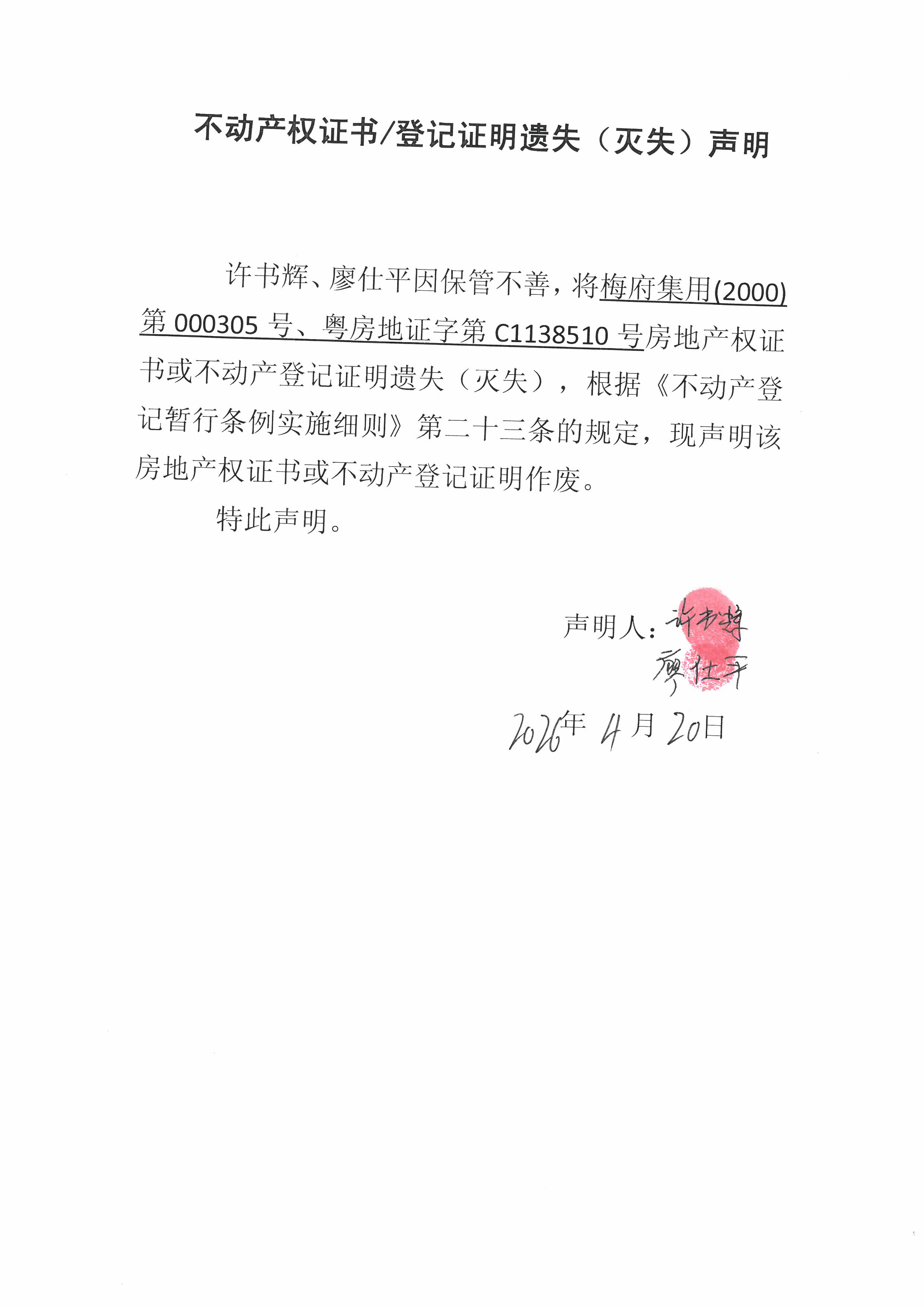 许书辉、廖仕平因保管不善,将梅府集用(2000)第000305号、粤房地证字第C1138510号房地产权证书或不动产登记证明遗失(灭失),根据《不动产登记暂行条例实施细则》第二十三条的规定,现声明该房地产权证书或不动产登记证明作废。