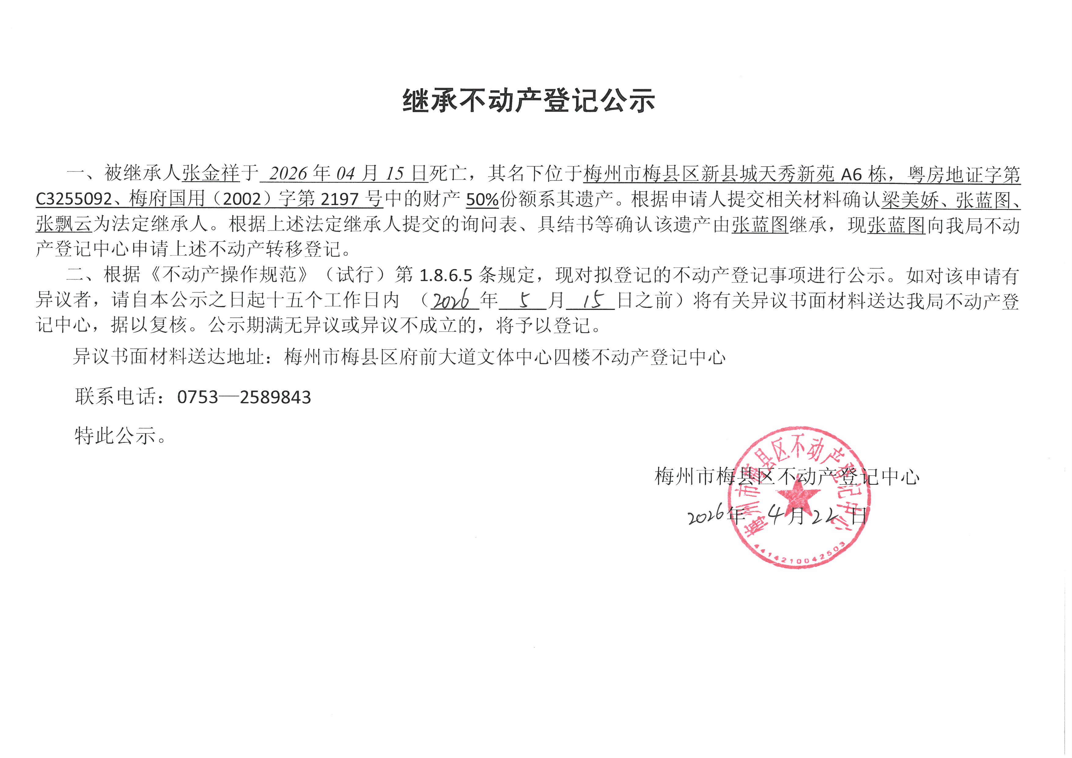 被继承人张金祥于2026年04月15日死亡,其名下位于梅州市梅县区新县城天秀新苑A6栋,粤房地证字策C3255092、梅府国用(2002)字第2197号中的财产50%份额系其遗产。根据申请人提交相关材料确认梁美娇、张蓝图、张飘云为法定继承人。根据上述法定继承人提交的询问表、具结书等确认该遗产由张蓝图继承,现张蓝图向我局不动产登记中心申请上述不动产转移登记。