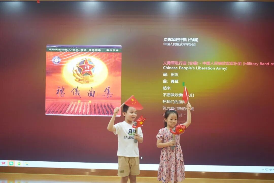 绘本共读结束后,知识竞答与手势舞轮番上演,让爱国情感落地生;老师解读国庆节由来与阅兵式意义,邀请孩子上台示范挺拔军姿,放声歌唱《义勇军进行曲》,嘹亮歌声里满是崇敬。