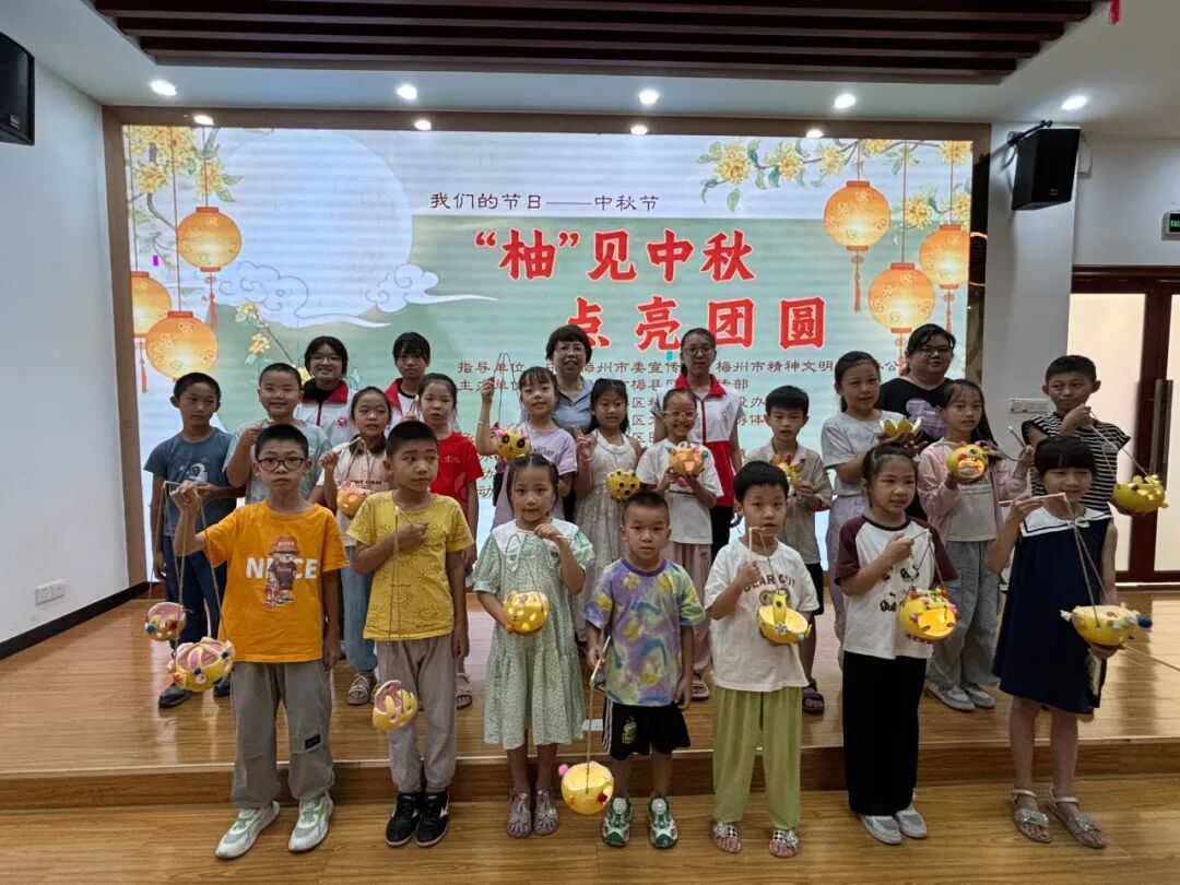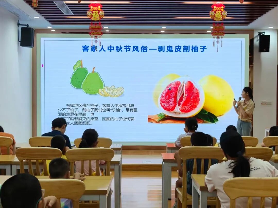 老师先播放一段介绍客家中秋节传统习俗的视频,随后邀请两位小朋友演唱客家儿歌《月光光》,在这一过程中,不仅加深了大家对客家中秋文化的了解,还自然引出了柚子灯的寓意 ——“柚” 谐音 “佑”,象征着吉祥与团圆。