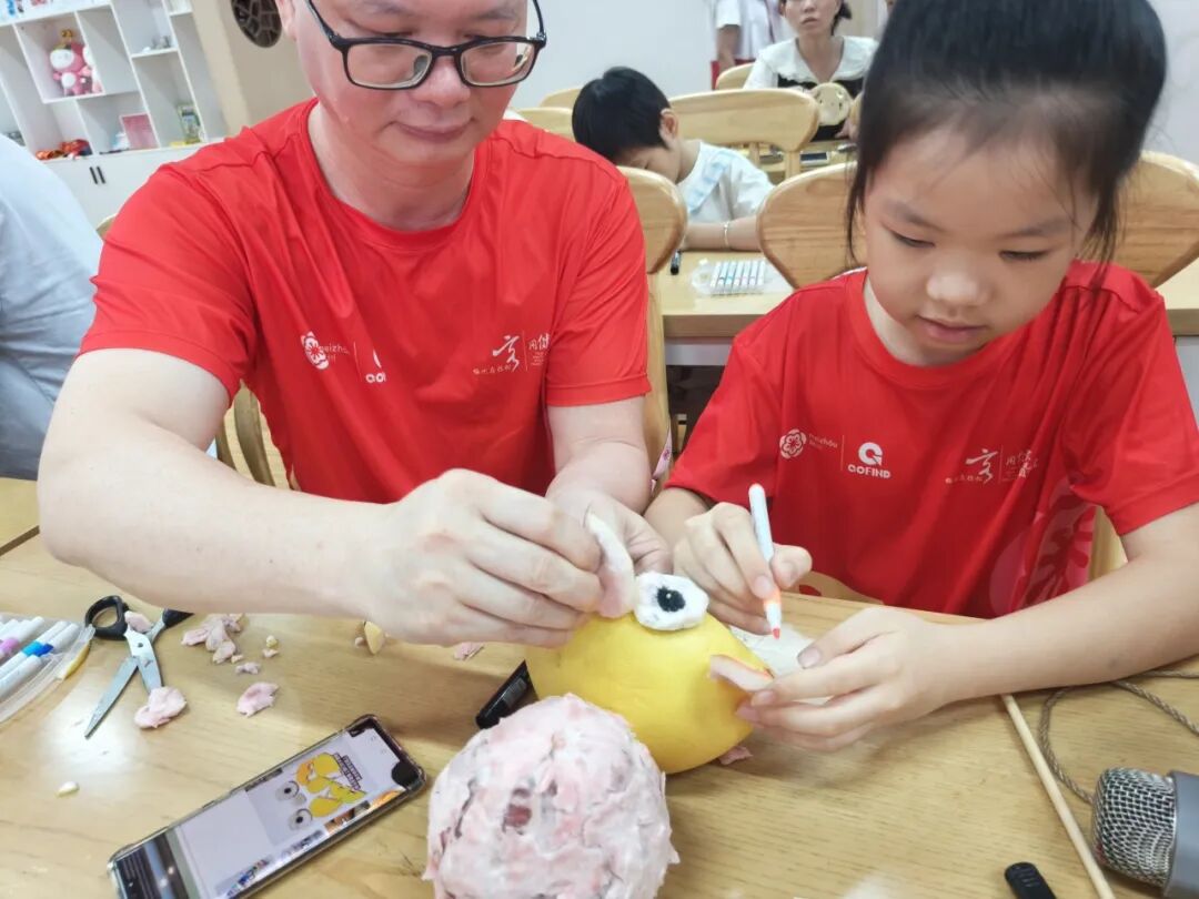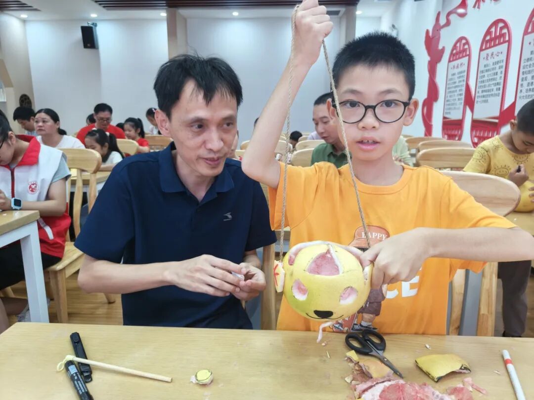 在老师的指导下,孩子和家长分工协作,制作柚子灯。孩子们先沿着柚子顶部画出圆形,家长小心去除顶盖,挖去内部的果肉;孩子接着在柚子皮表面画出兔子、月亮、祥云等中秋元素图案;最后用安全刻刀沿着图案轮廓慢慢雕刻,待图案成型后,放入灯串,一盏充满童趣的柚子灯便完成啦。