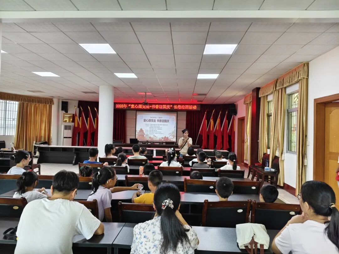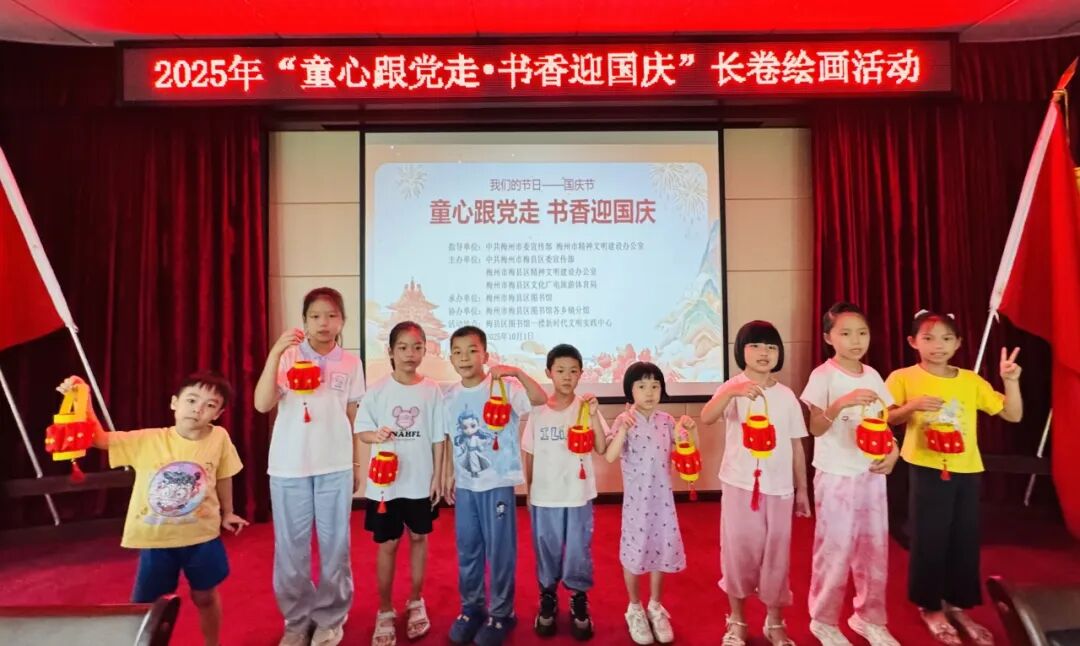 10月1日上午,“童心跟党走・书香迎国庆” 国庆节长卷绘画活动在梅县区图书馆二楼讲座厅热闹开启。活动现场,伴随着庄严的《义勇军进行曲》,升国旗视频缓缓播放。在场的孩子们目光坚定,跟着视频旋律认真奏唱国歌,嘹亮的歌声里满是对祖国的热爱与崇敬,瞬间点燃了现场的爱国氛围,为活动拉开了庄重的序幕。