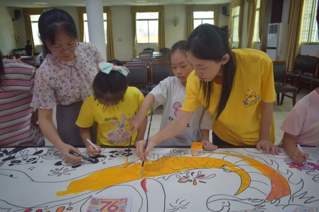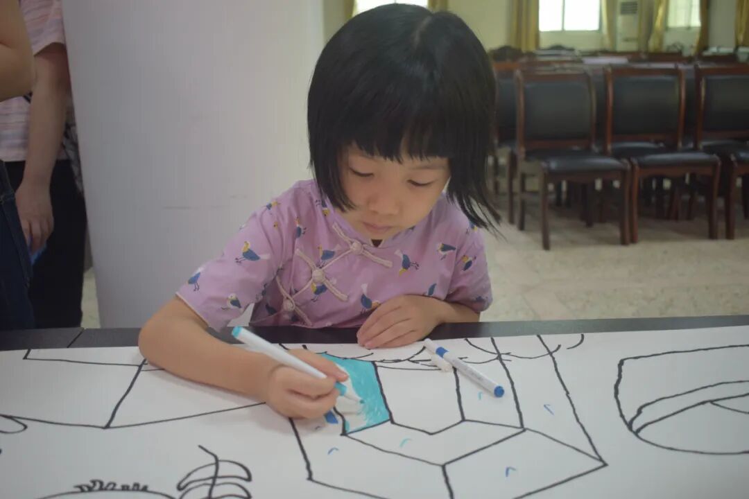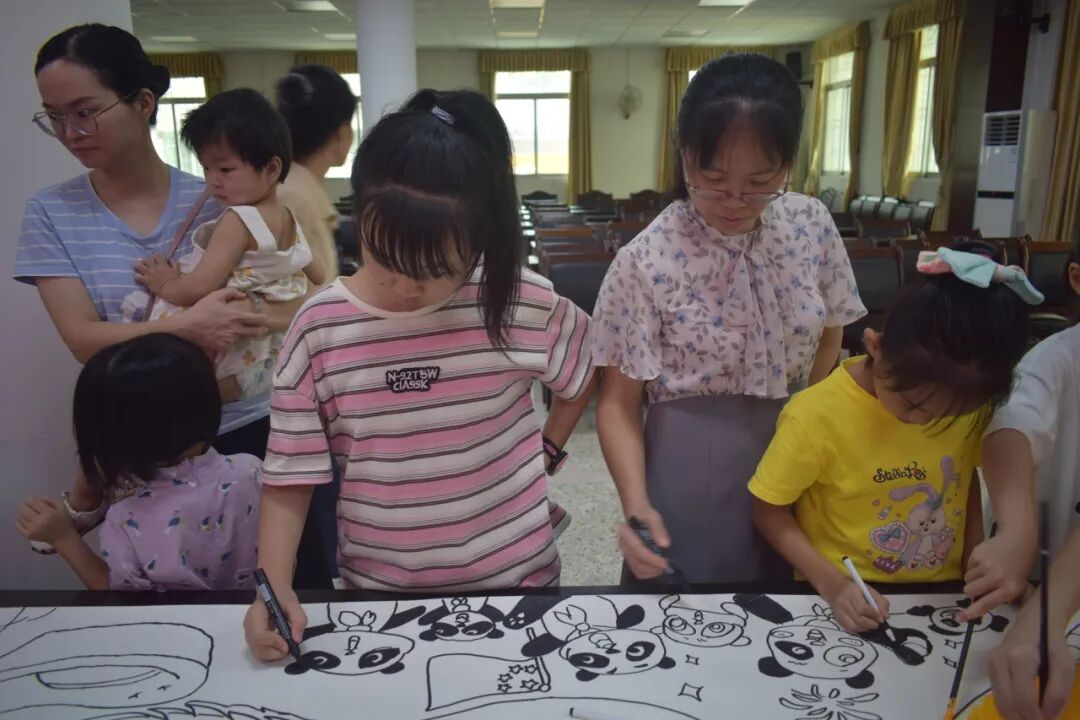 活动的压轴环节是 “手绘中华梦,我的祖国绘画长卷”。孩子与家长一同围在长卷旁,手持画笔尽情创作:有的专注勾勒亭台楼阁等传统建筑,有的认真画下象征和平的和平鸽,还有的在画卷上细致描绘出威严的龙与飘逸的祥云......大家分工协作、相互配合,完成了一幅色彩斑斓、充满童趣与爱国情怀的长卷。