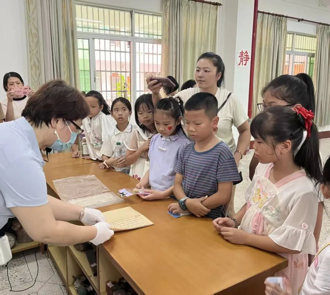 10月1日上午,梅县区图书馆工作人员先带领孩子们参观古籍展,在讲解中引导大家触摸历史脉络,感受古籍跨越千年的文化魅力。