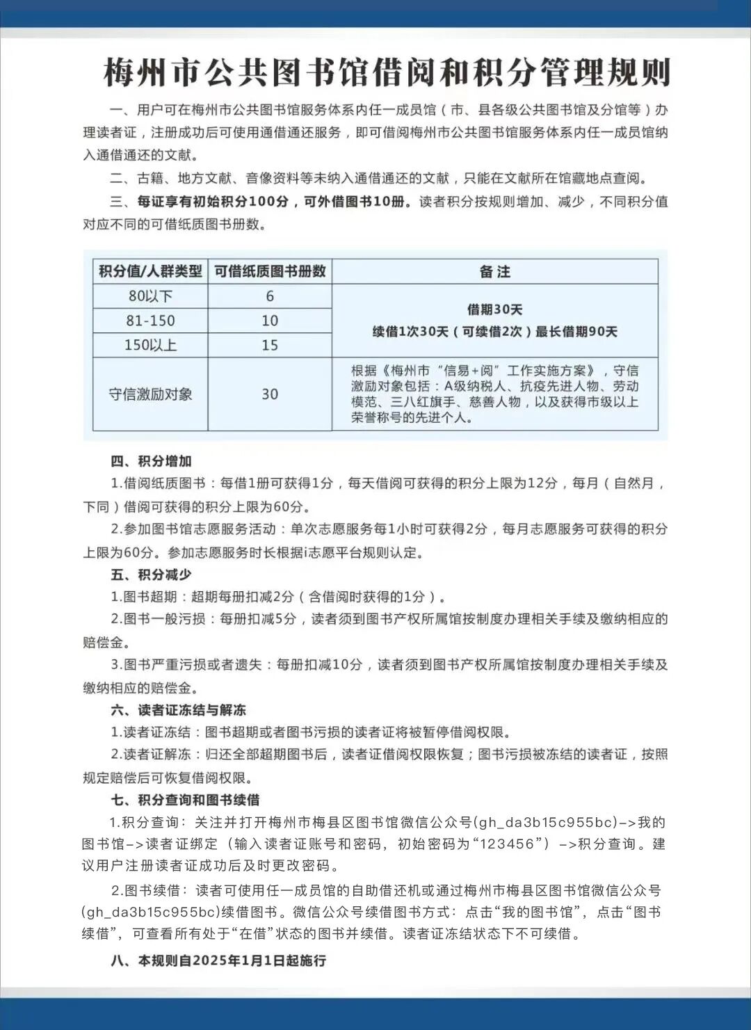为更好地保障公众借阅需求,进一步促进全民阅读,鼓励读者多读书和更好地利用图书馆资源,图书馆对现有积分和借阅规则进行了调整。2025年1月1日起梅州市公共图书馆统一借阅规则已做如下调整:新规则