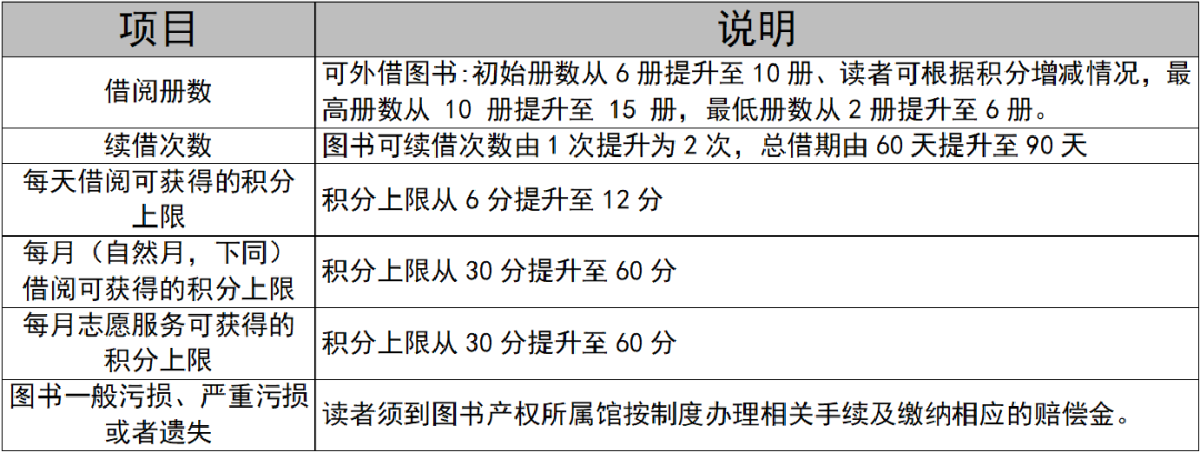 为更好地保障公众借阅需求,进一步促进全民阅读,鼓励读者多读书和更好地利用图书馆资源,图书馆对现有积分和借阅规则进行了调整。