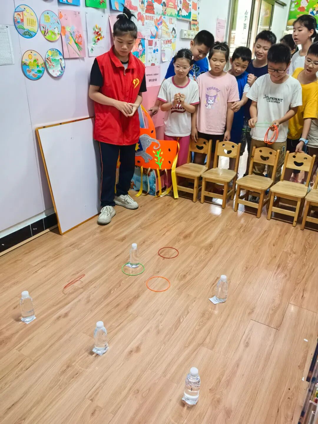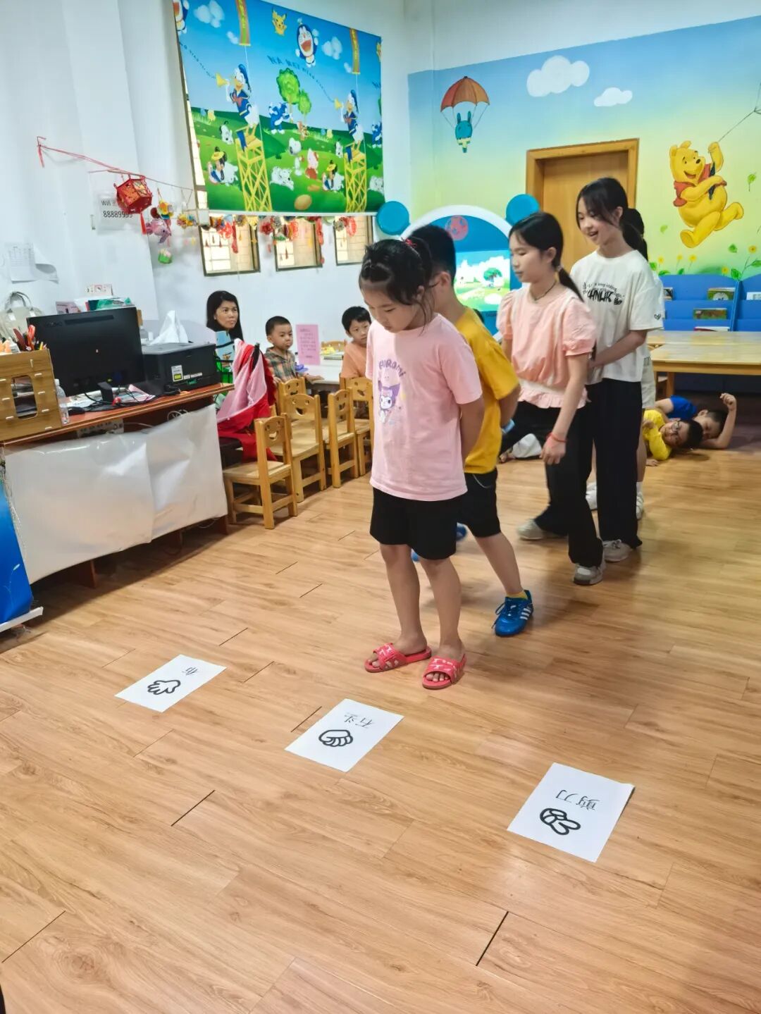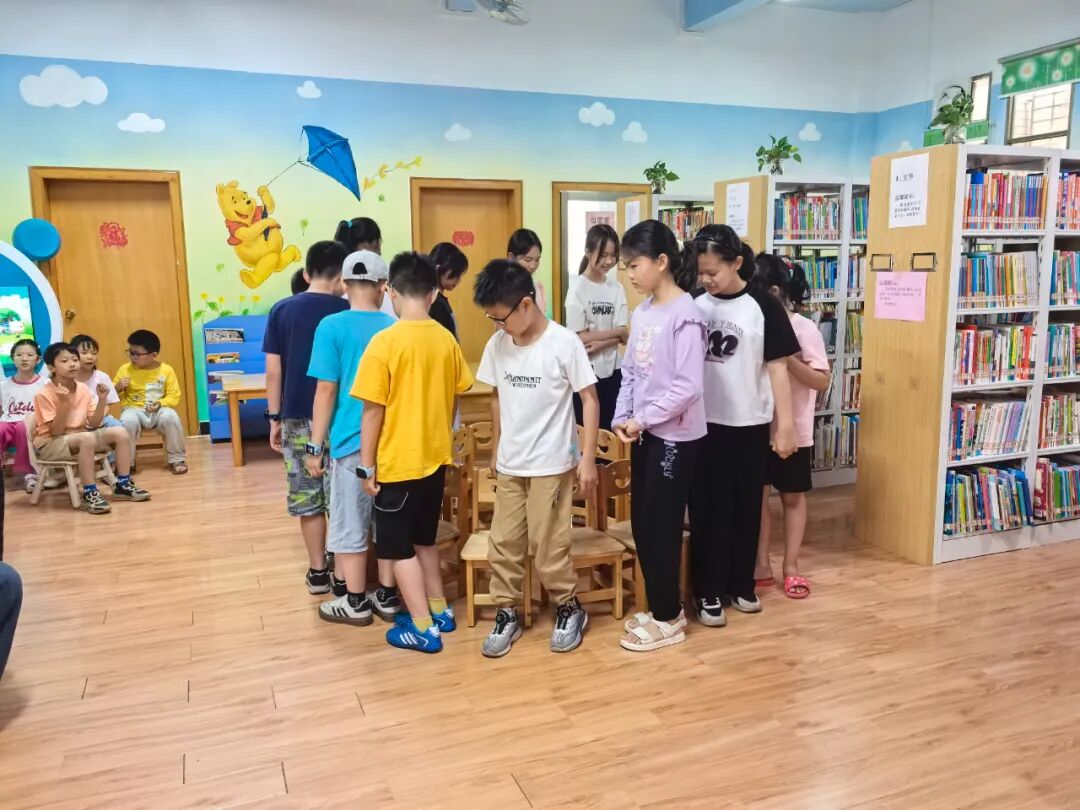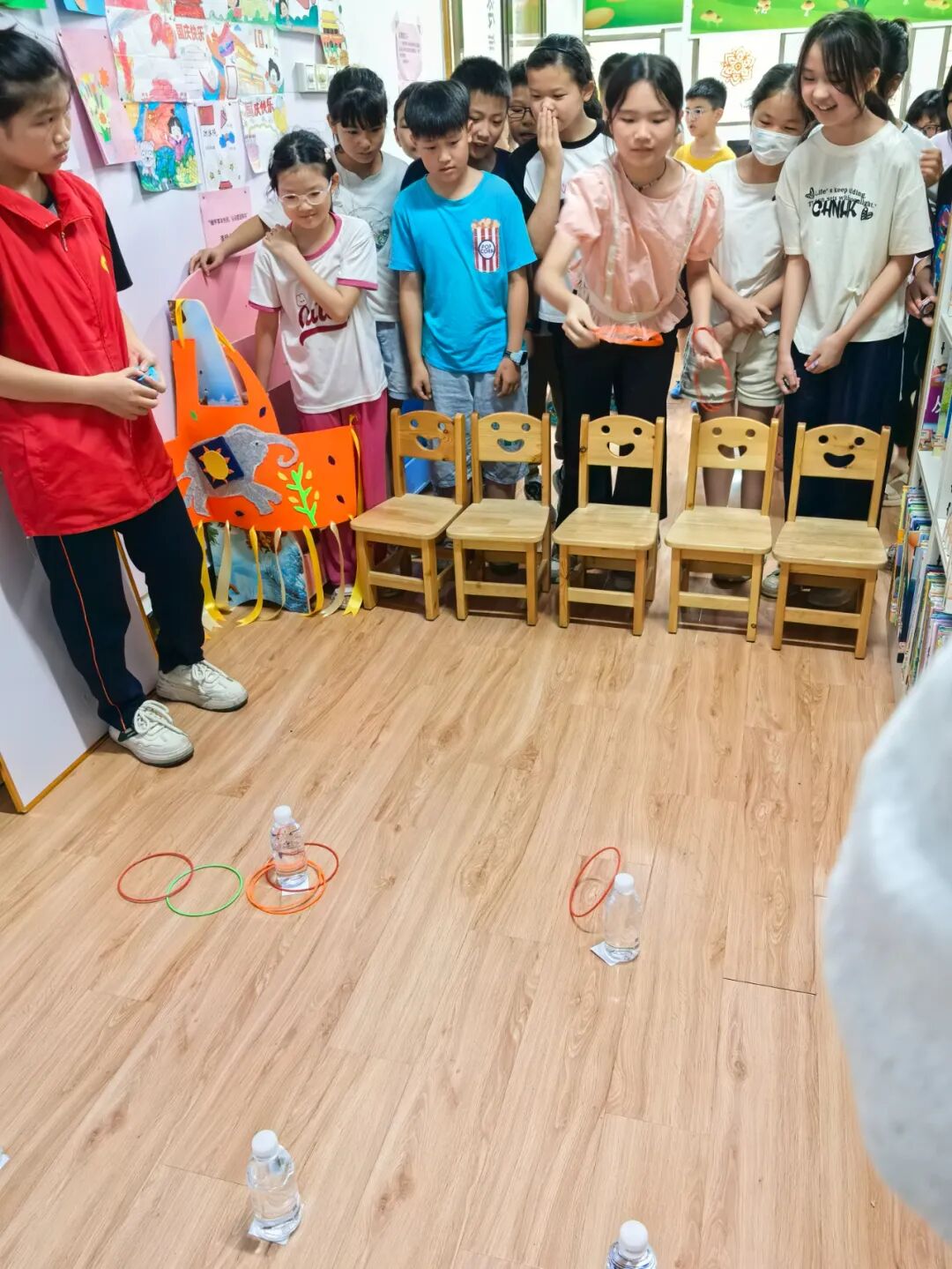 松口图书馆的小莹老师先给小朋友们讲解此次活动8个游戏的玩法以及得分规则。游戏包括:抢椅子、石头剪刀布跳跃、红黄蓝色跳跃、饮料种类跳跃、吹纸牌、数到30、套水瓶、套益智塔。