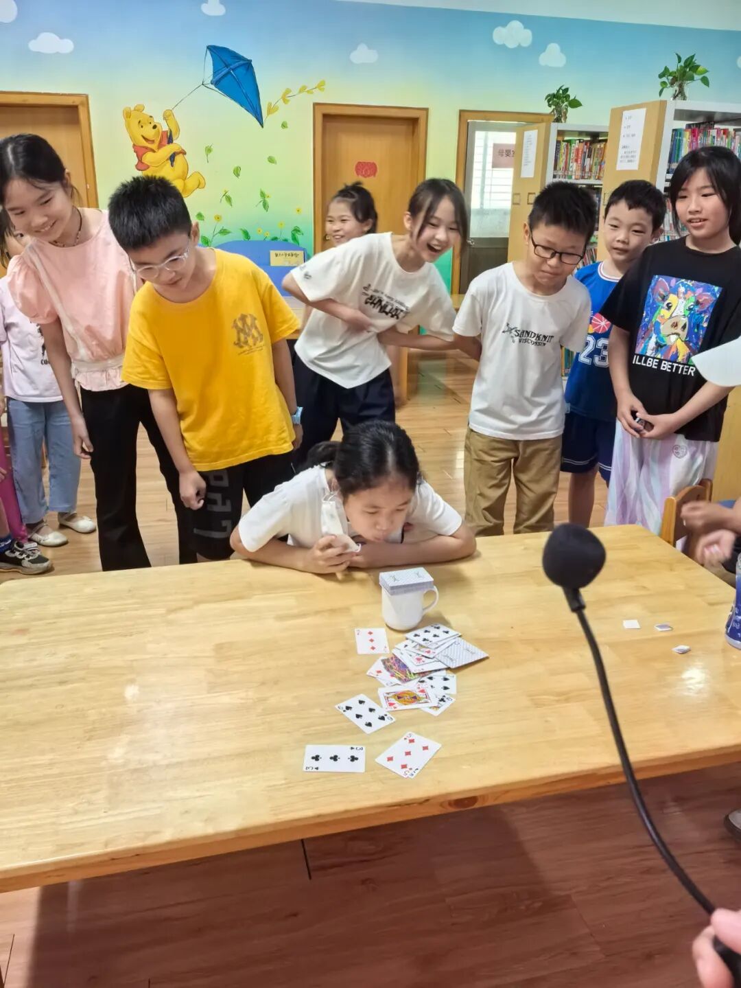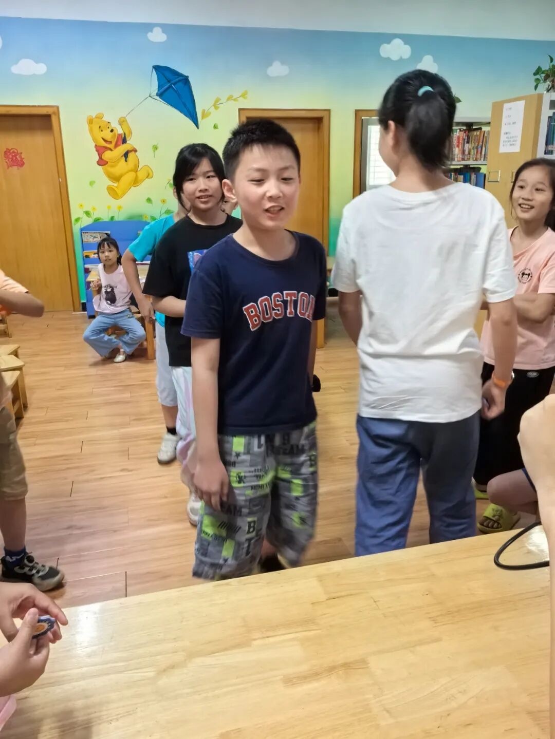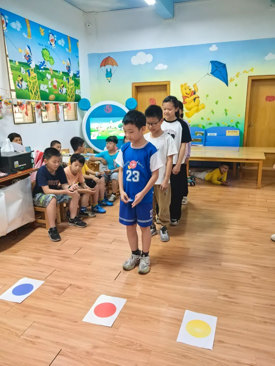 松口图书馆的小莹老师先给小朋友们讲解此次活动8个游戏的玩法以及得分规则。游戏包括:抢椅子、石头剪刀布跳跃、红黄蓝色跳跃、饮料种类跳跃、吹纸牌、数到30、套水瓶、套益智塔。