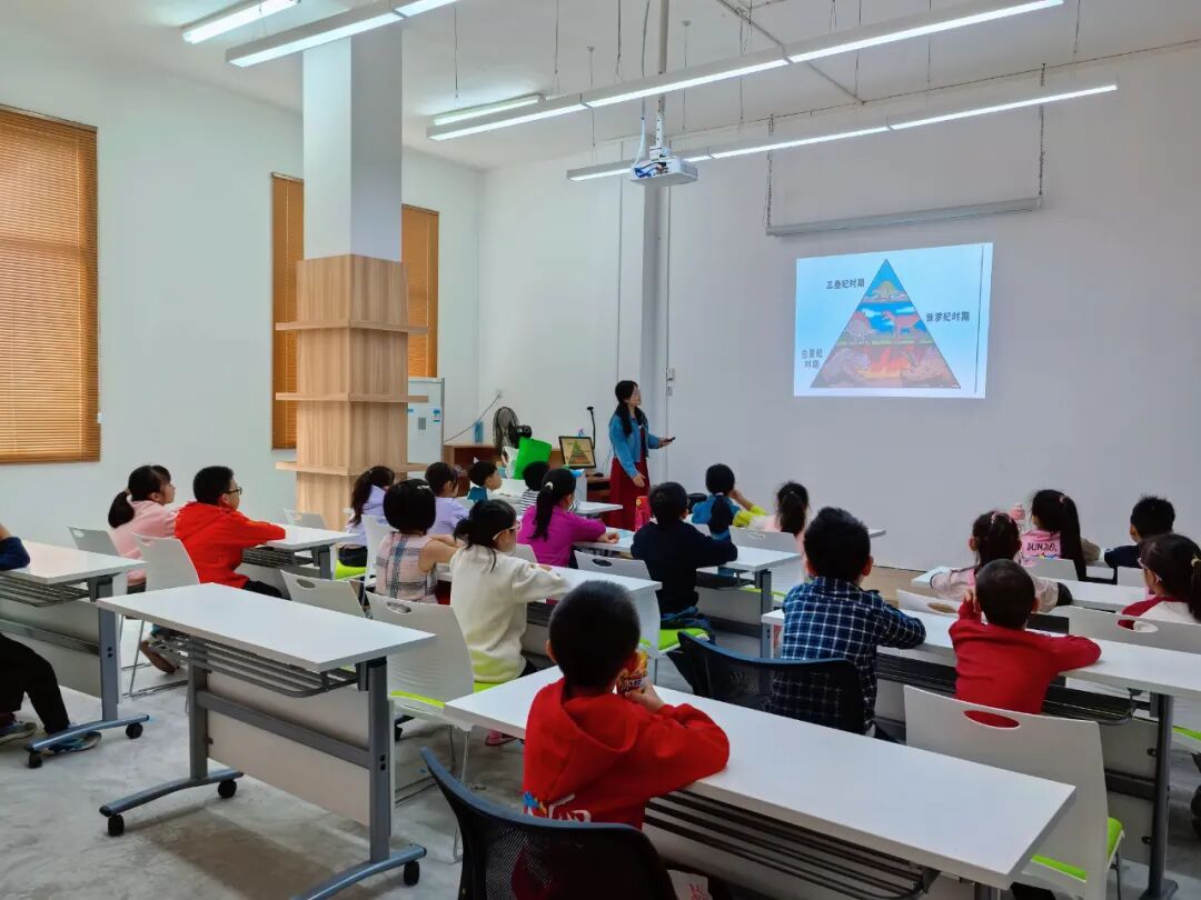 活动导入环节,松口图书馆的小莹老师先问小读者们对自己平时非常喜爱的恐龙了解有多少?小朋友们积极抢答,老师接着科普恐龙的基本知识:如恐龙生活的年代,出示不同类型恐龙的图片以及播放恐龙时代视频片段。