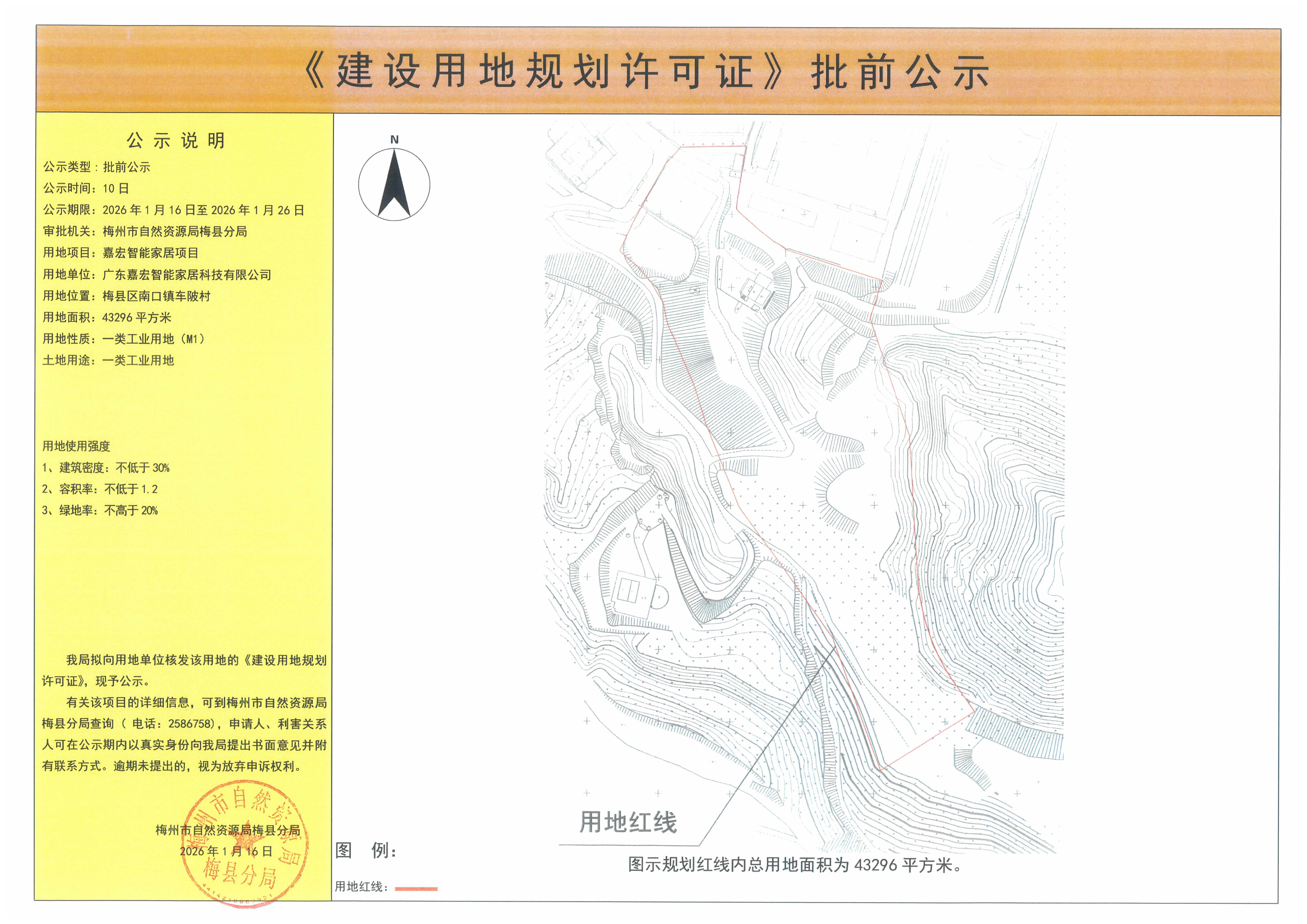 我局拟向广东嘉宏智能家居科技有限公司核发该用地的《建设用地规划许可证》,现予公示。