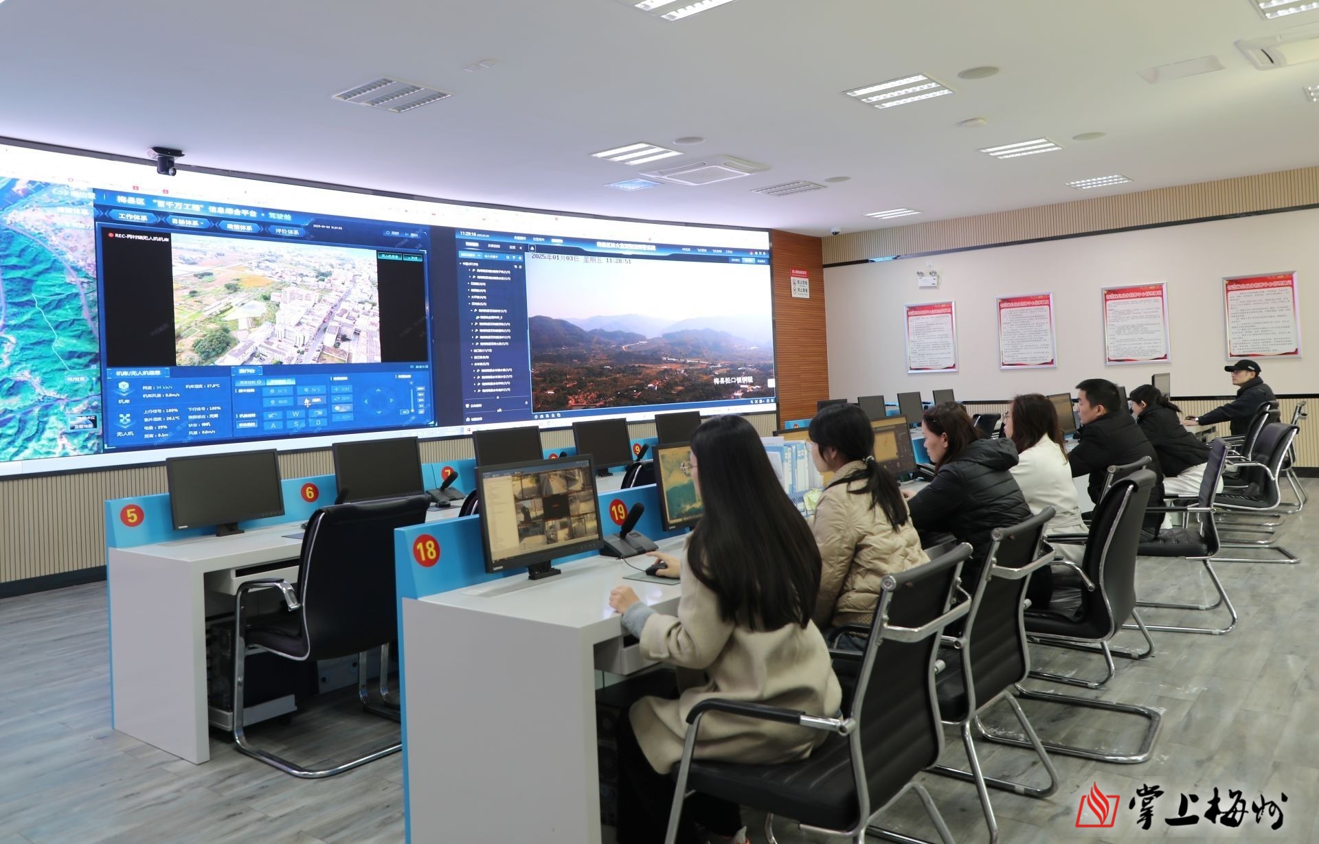 在智慧梅县政务指挥中心,工作人员紧盯大屏幕对无人机进行指挥调度。
